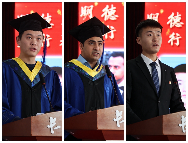 杜林竹、王力、刘万琦同学分别代表毕业研究生、留学生毕业生、在校研究生发言。
