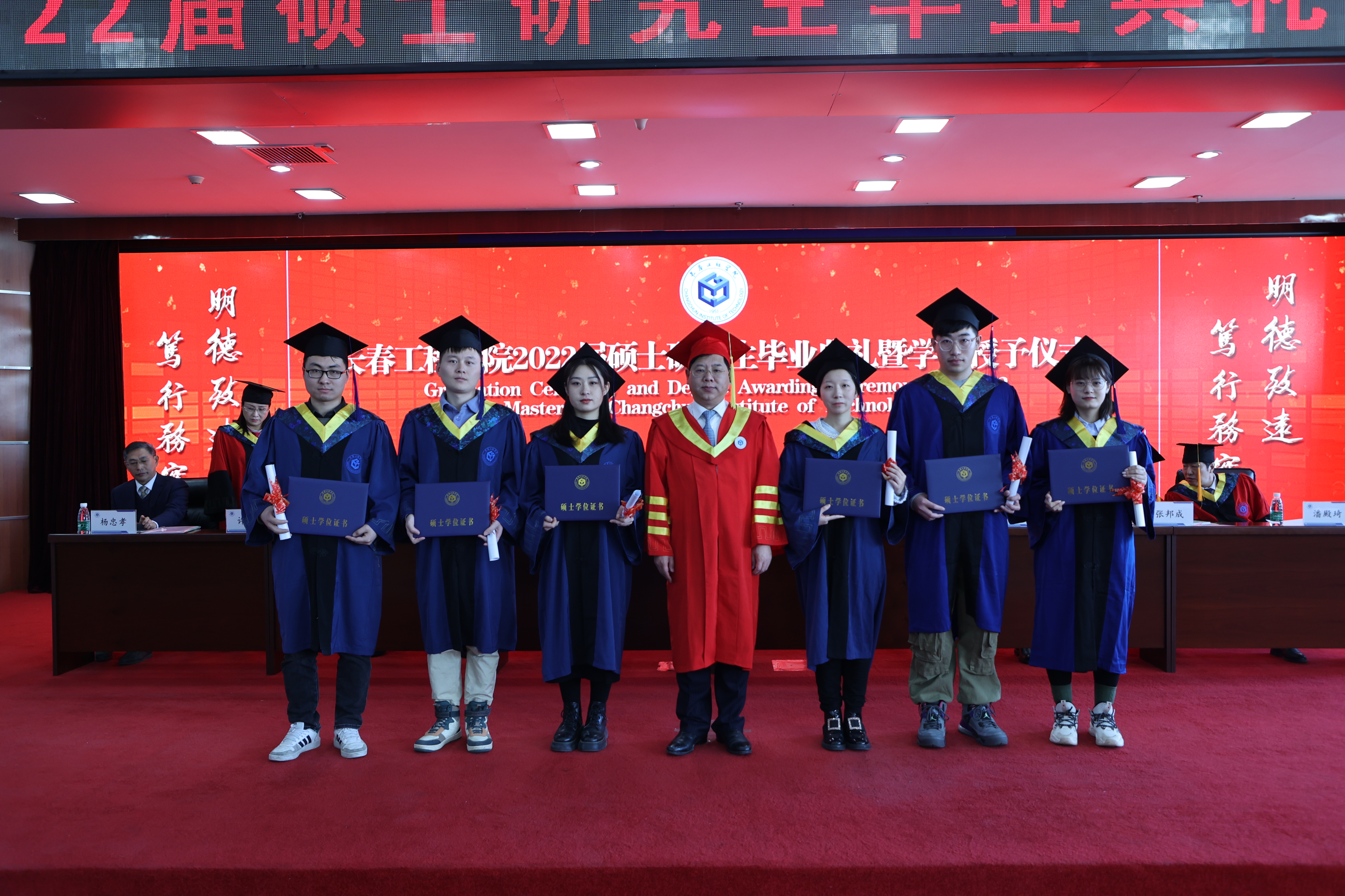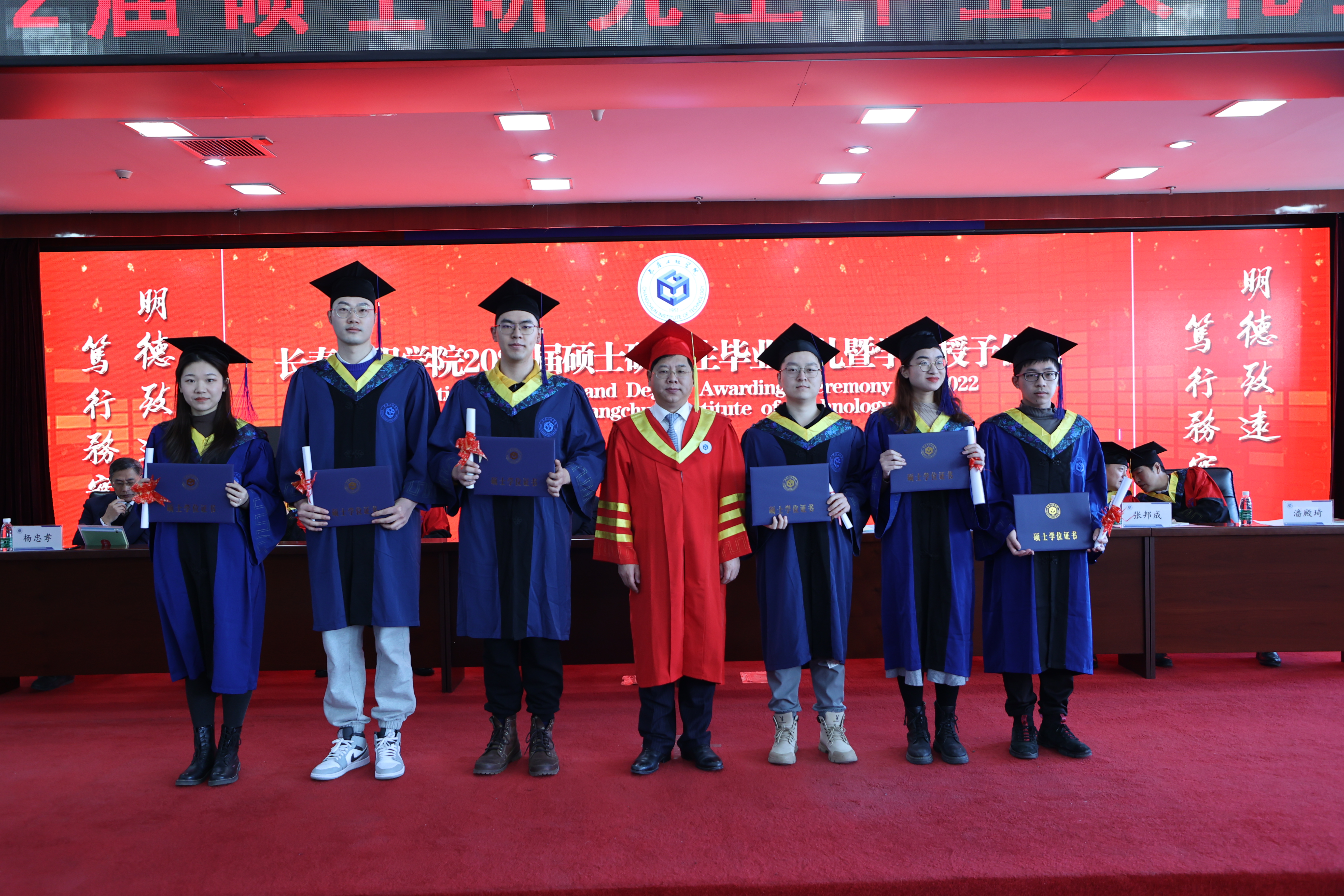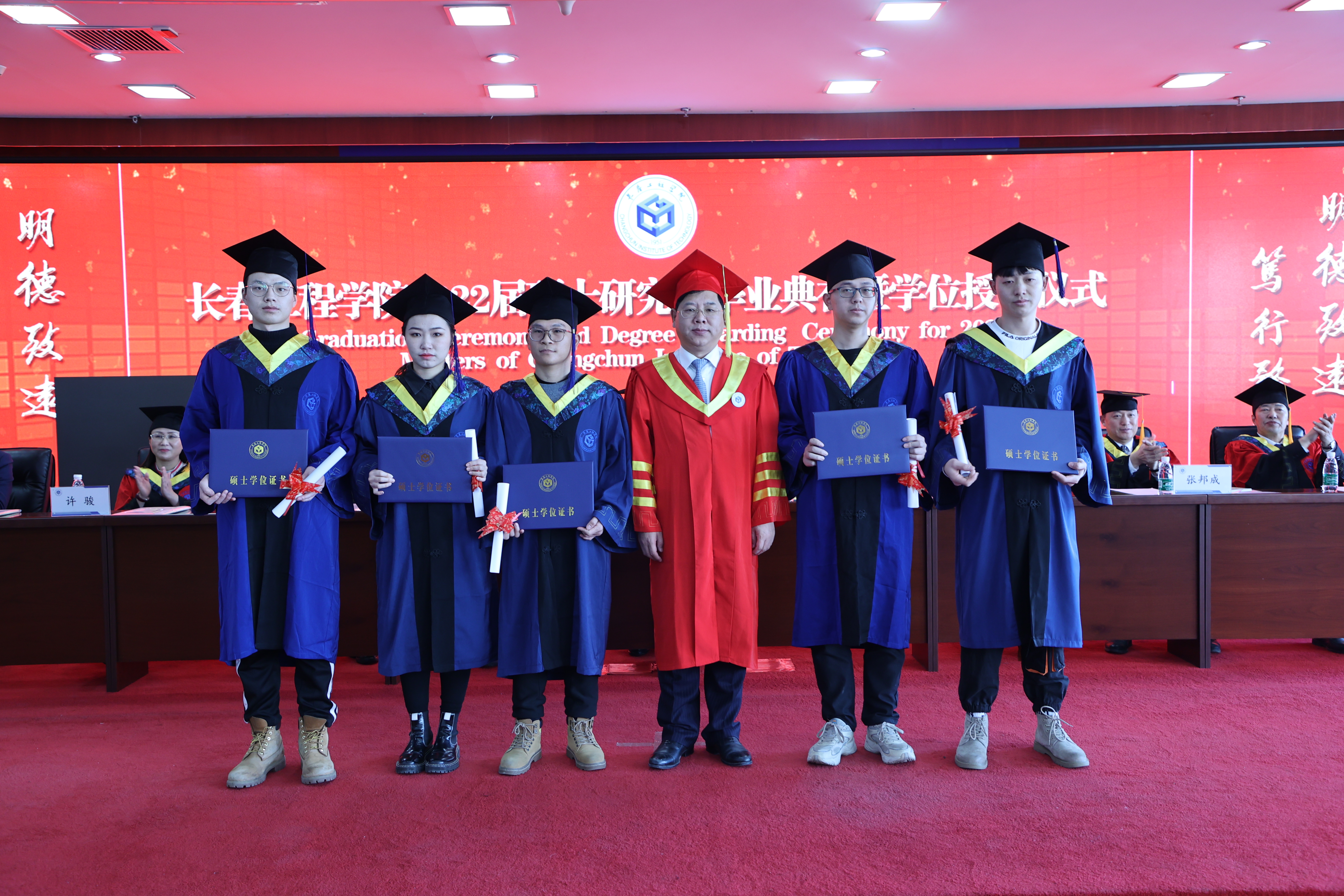 学校校长陈权为毕业生颁发了学位证书和毕业证书,并合影留念。