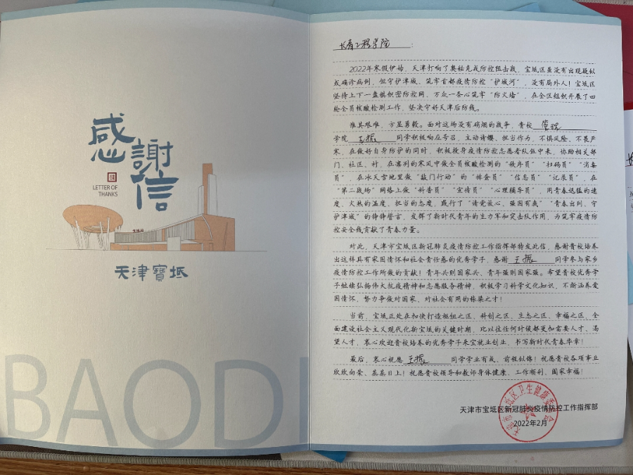 近日,学校收到来自天津市宝坻区新冠肺炎疫情防控工作指挥部的感谢信,信中对长春工程学院及周政峤等几位同学表示感谢。