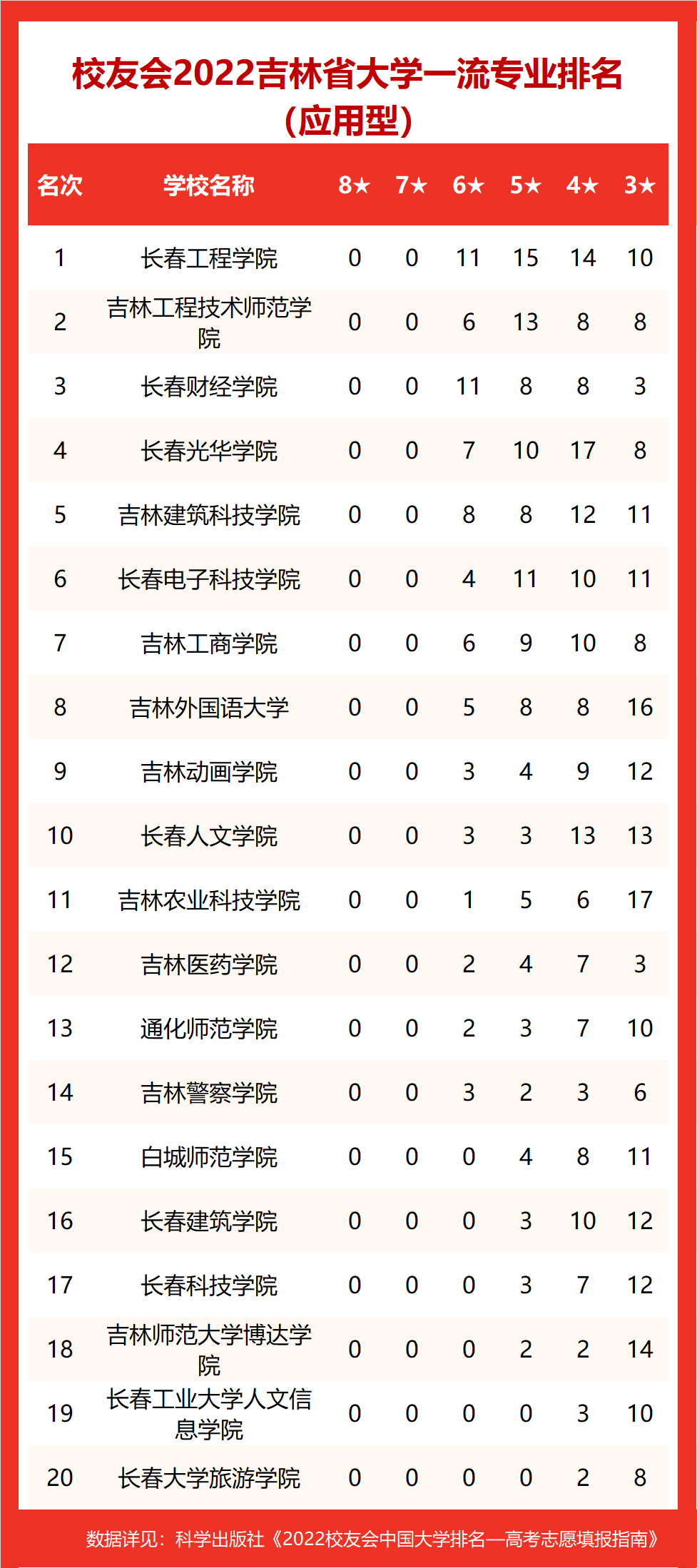 近日,由全国第三方大学评价机构艾瑞深校友会网(Cuaa.Net)撰写完成、科学出版社出版发行的《2022校友会中国大学排名—高考志愿填报指南》发布了最新校友会2022吉林省大学一流专业排名。榜单显示,在最新校友会2022中国大学一流专业排名(应用型)中,长春工程学院有 11个中国六星级专业(6★),15个中国五星级专业(5★), 14个中国四星级专业(4★),位居校友会2022吉林省大学(应用型)排名第一。