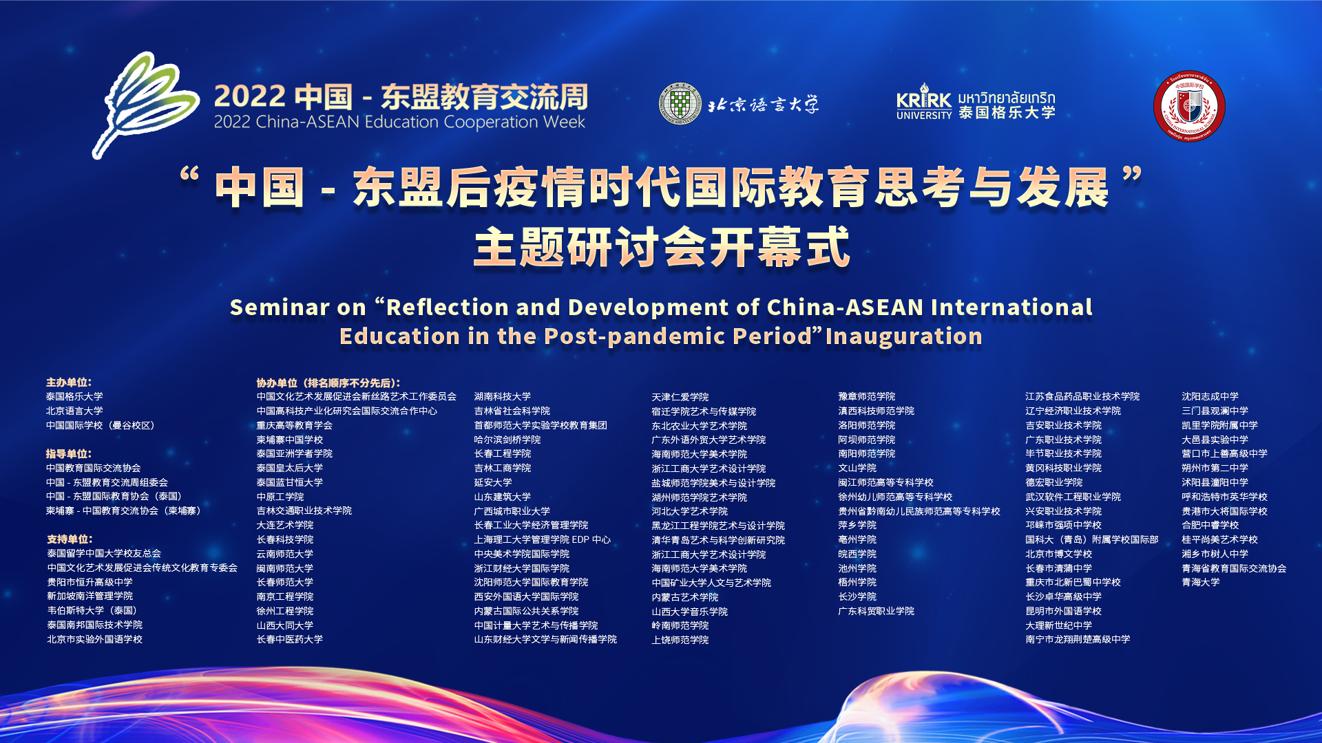 12月3日至4日,中国-东盟教育交流周“后疫情时代国际教育思考与发展”主题研讨会在泰国曼谷举办。此次研讨会在中国教育国际交流协会、中国东盟国际教育协会等单位的指导下,由泰国格乐大学、泰国-中国国际学校和北京语言大学三校联合主办,旨在增进中国与东盟友谊,开展教育合作,加强区域间文化交流。我校作为研讨会协办单位之一线上参加活动。校长陈权、副校长王朝勇参加了会议。