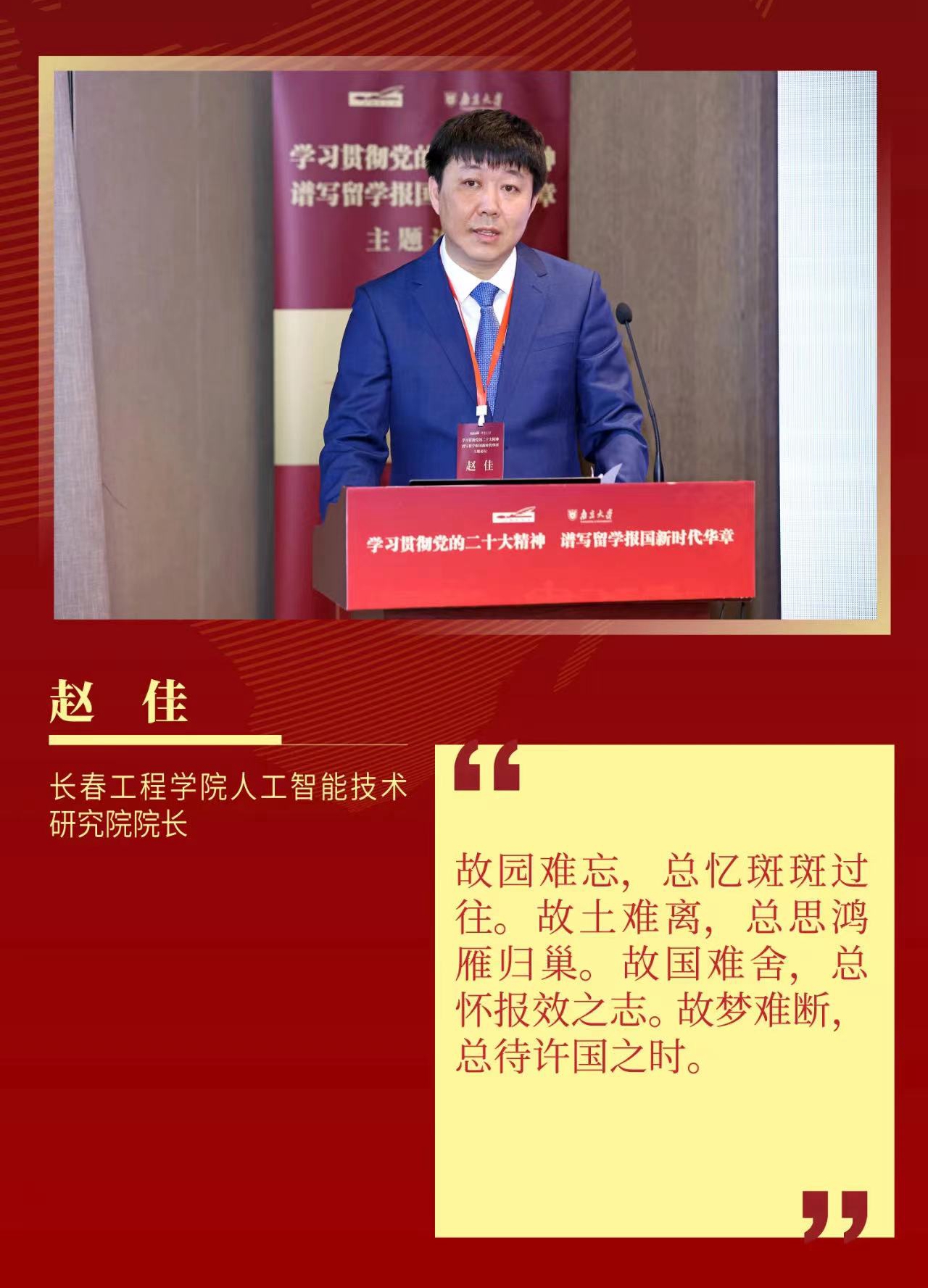 主题论坛结束后,在吉林省委统战部、吉林省欧美同学会(吉林省留学人员联谊会)主办的全省留学人员“智力支持吉林振兴 留学谱写报国华章”座谈会上,赵佳教授作了题为“遍育桃李哺芳华 一片丹心献故园”的主题报告。赵佳教授有决心把爱国的理想、爱乡的情怀、爱校的志向,统一到自己治学从教、立德树人的工作中。在学校党委的领导下,在统战旗帜的指引下,以百倍的热情铆足干劲,以万丈的豪情力争上游,为把我校建设成国内一流应用型大学,再续新篇,再创辉煌。