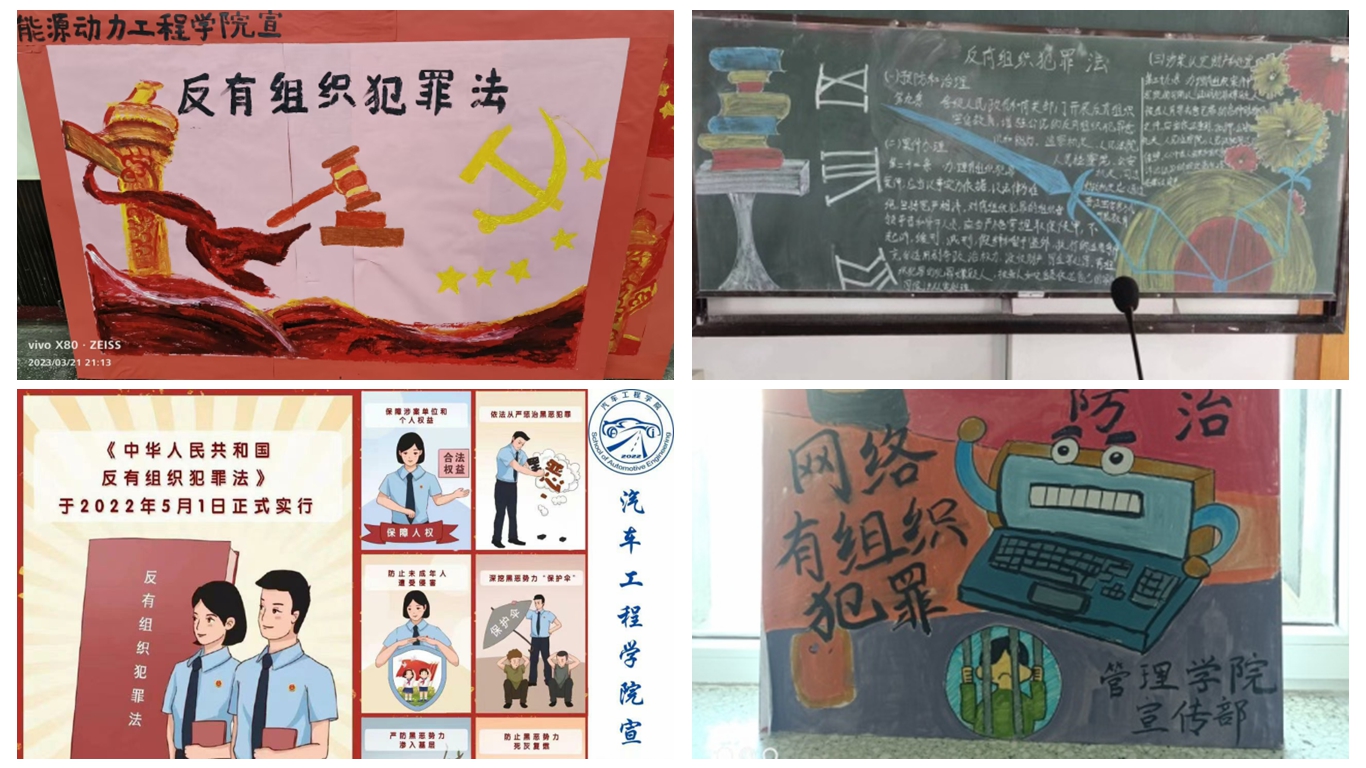 保卫处与学生工作处积极组织开展了《中华人民共和国反有组织犯罪法》普法宣传主题班会、“听青年之声,行维权之责”签字活动、以“反对组织犯罪,净化社会风气”为主题的观影活动等,此外,通过制作宣传板、制作公众号推文等形式扩大宣传范围、增强宣传效果。