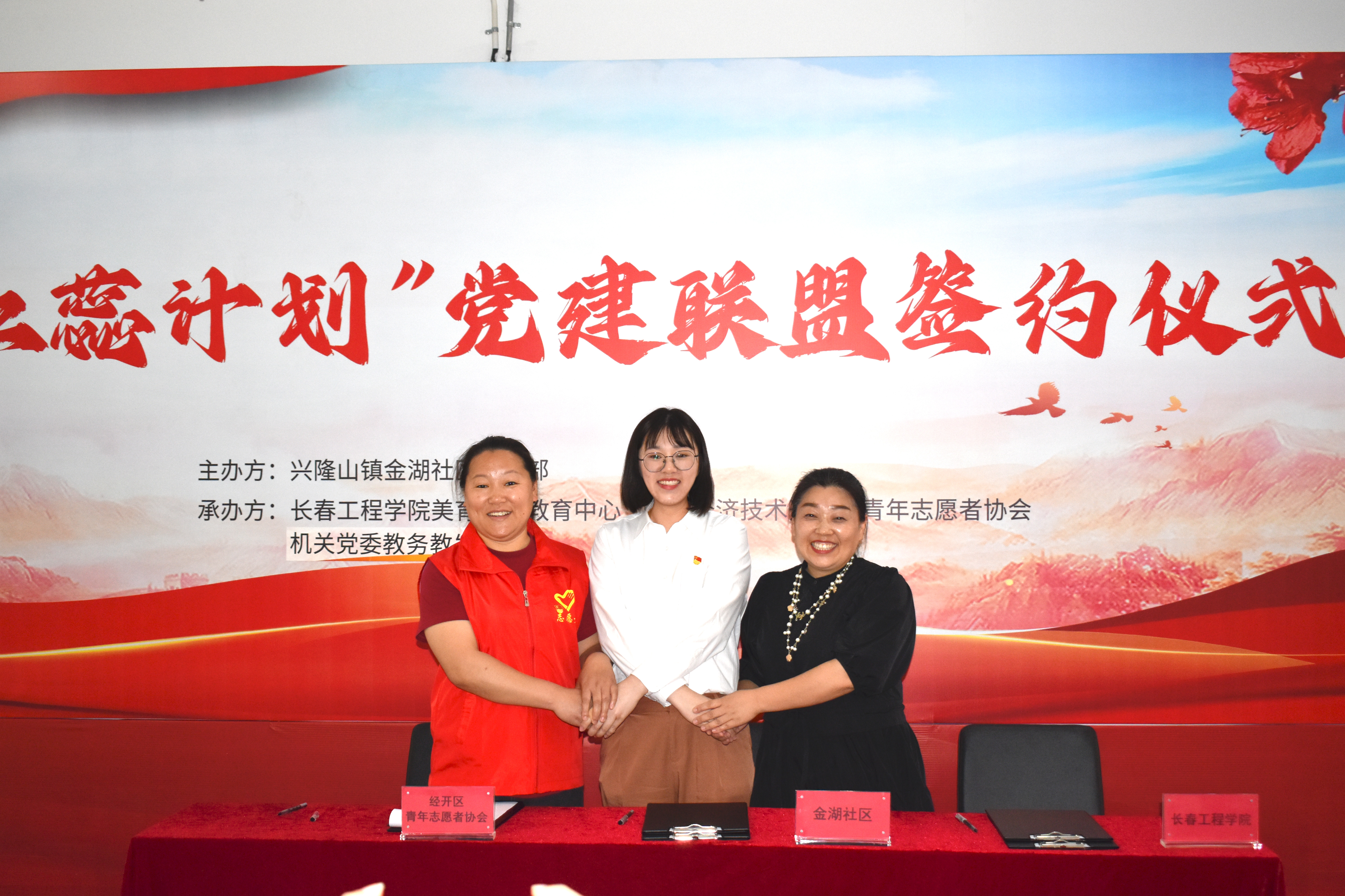 5月31日,学校机关党委教务教发党支部与兴隆山镇金湖社区、长春经济技术开发区青年志愿者协会三方结对共建“映山红·红蕊计划”党建联盟签约仪式在金湖社区活动中心举行。