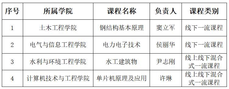 近日,教育部公布了第二批国家级一流本科课程认定结果,我校共有4门课程被认定为国家级一流本科课程,其中线下一流课程2门,分别为《钢结构基本原理》《电力电子技术》;线上线下混合式一流课程2门,分别为《水工建筑物》《单片机原理及应用》。本次获批国家级一流本科课程实现了学校一流课程建设的历史性突破,体现了学校在课程建设方面取得的新成效。