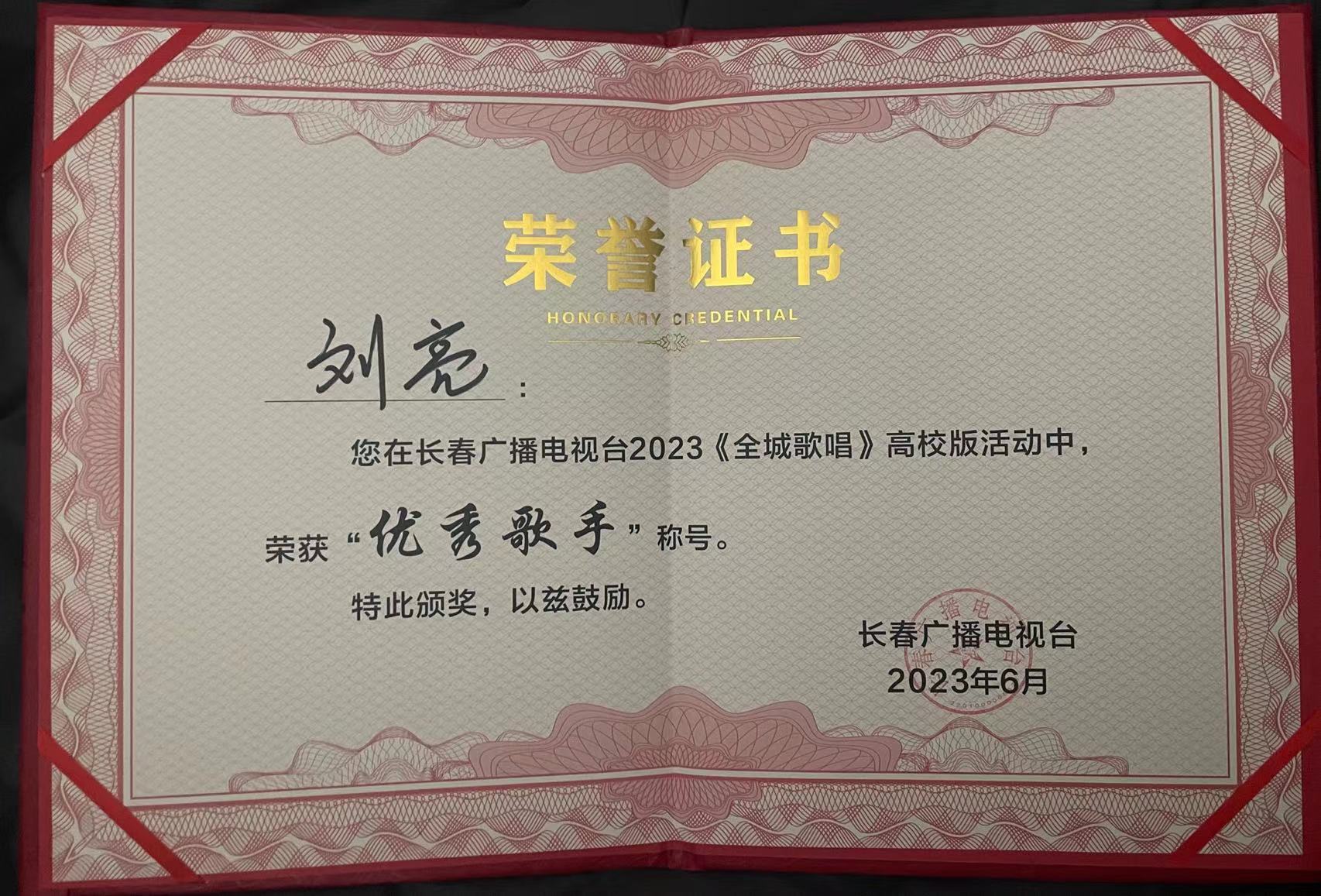 近日,历时两月余的“唱出你我风采,唱出幸福长春”长春市2023《全城歌唱》高校版决赛在长春市电视台落下帷幕。我校水利与环境工程学院环科2141班刘亮同学代表学校参赛,经过层层选拔,成功闯入“长春市二十强”,并获得了“优秀歌手”荣誉称号。