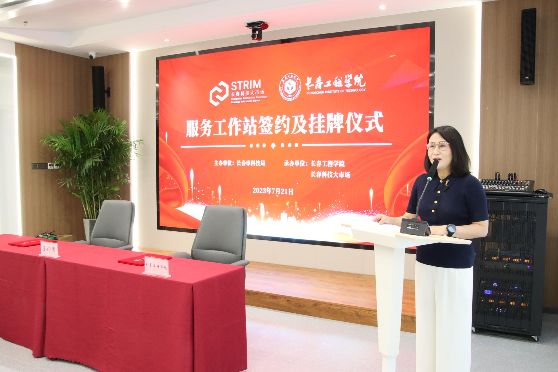 会上,学校资产经营管理有限责任公司总经理刘国松与长春科技大市场总经理刘丽波签订了合作协议,共同为长春工程学院科技服务工作站挂牌。