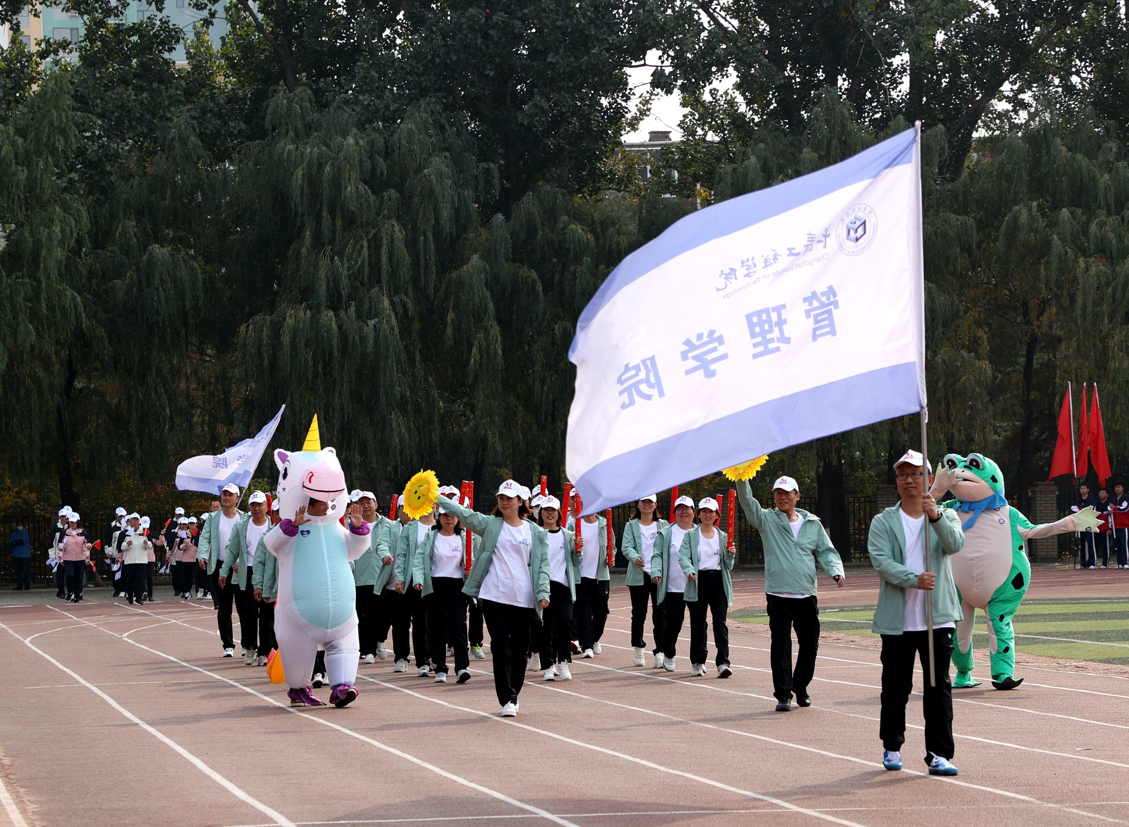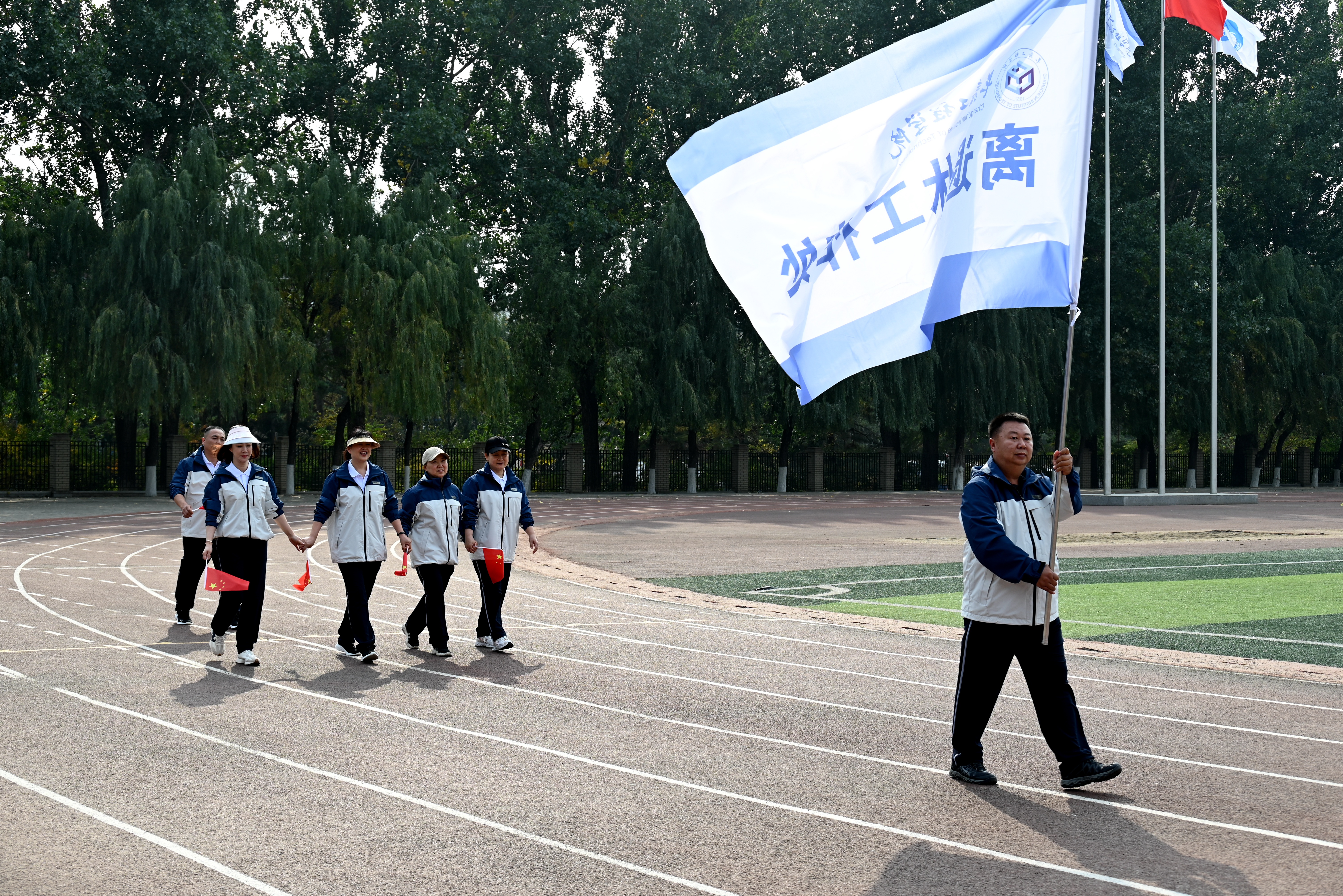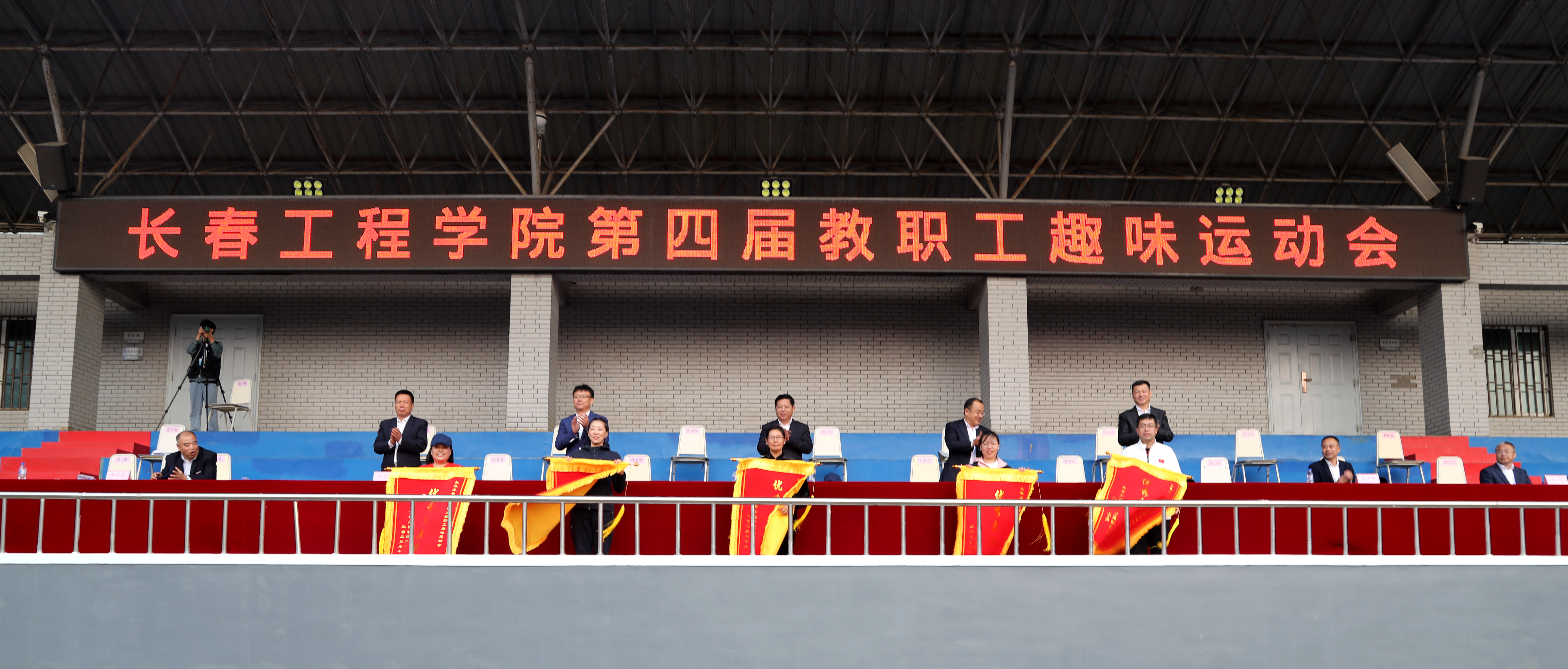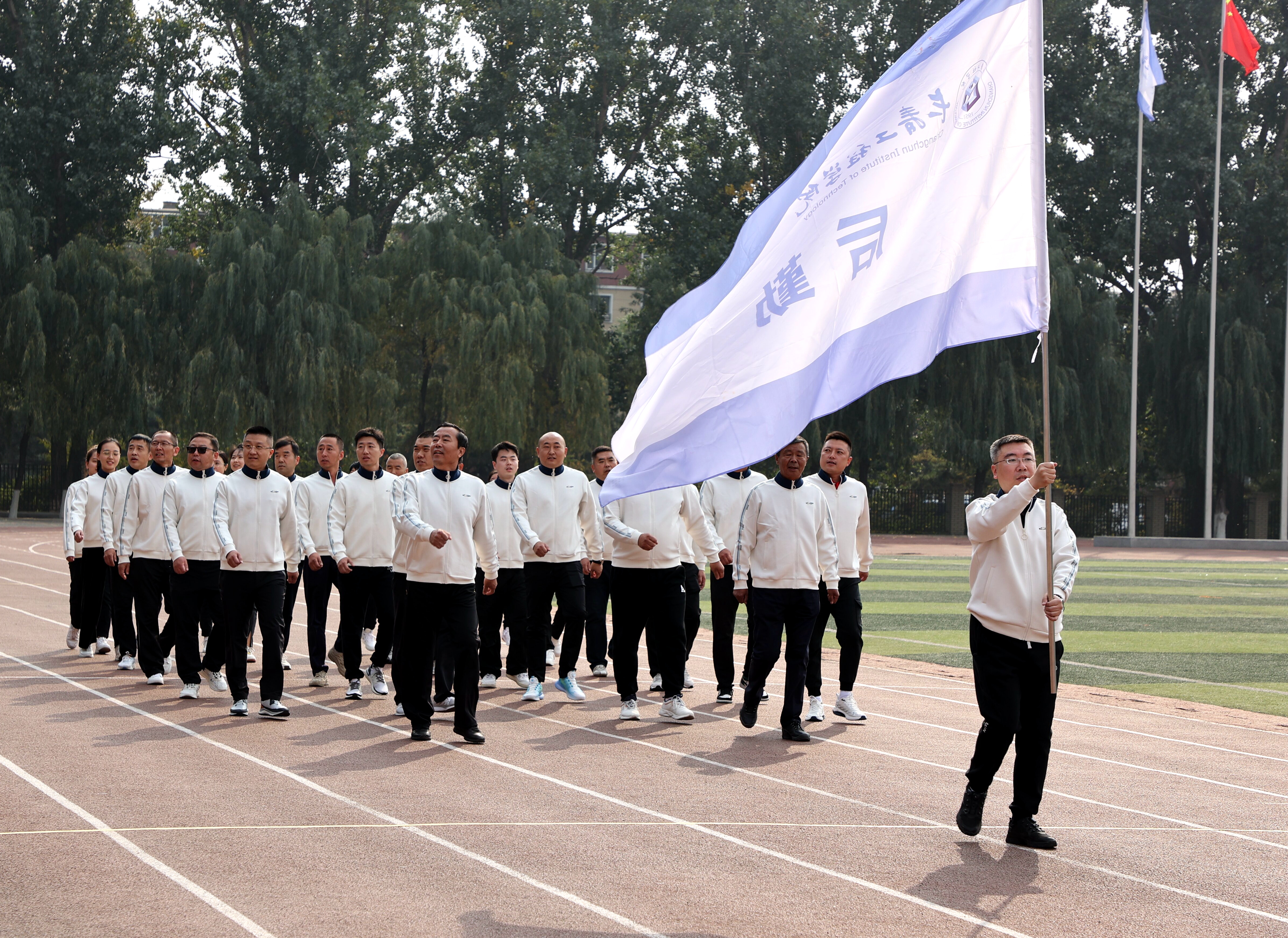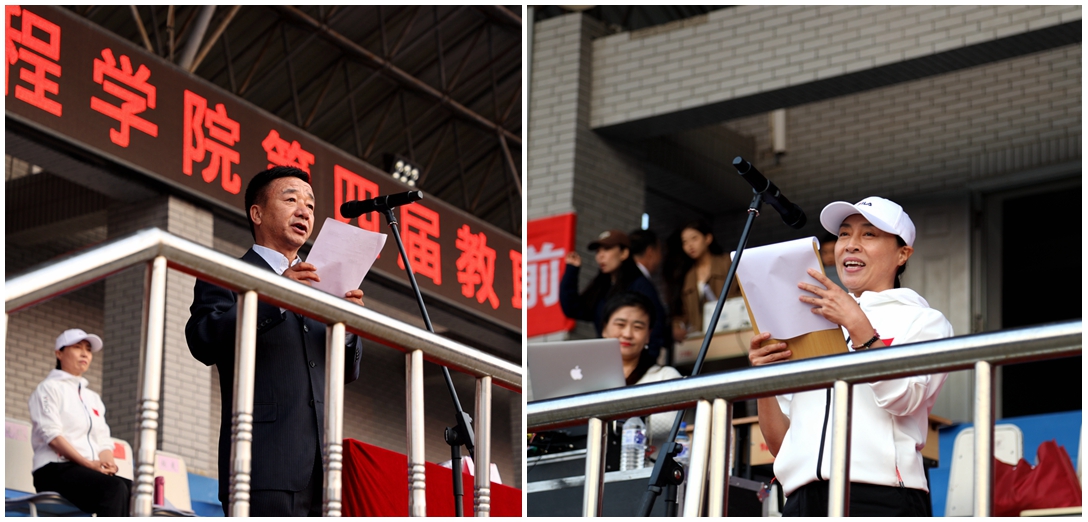校长陈权宣布长春工程学院第四届教职工趣味运动会开幕。运动场上鼓声阵阵,队旗挥舞。