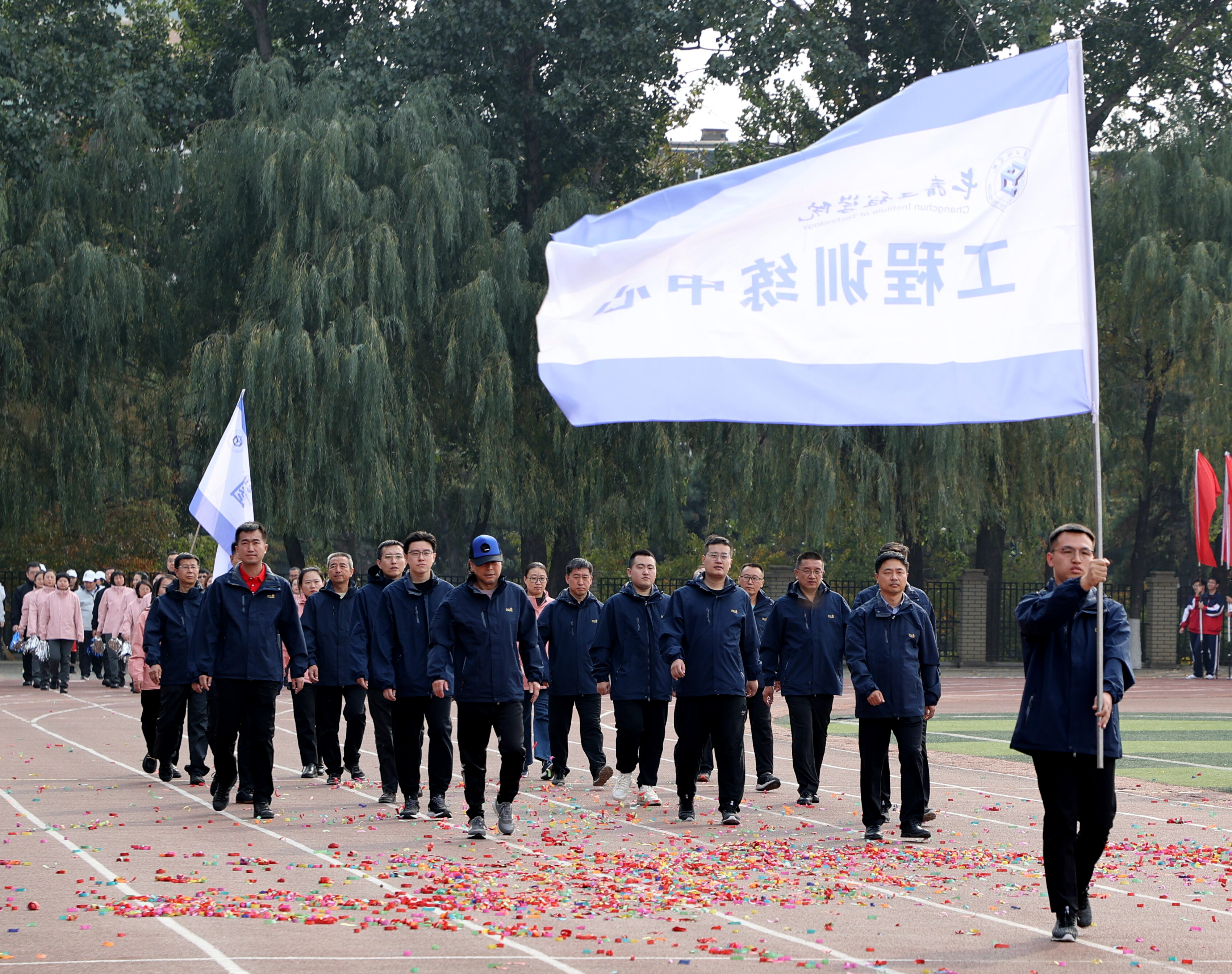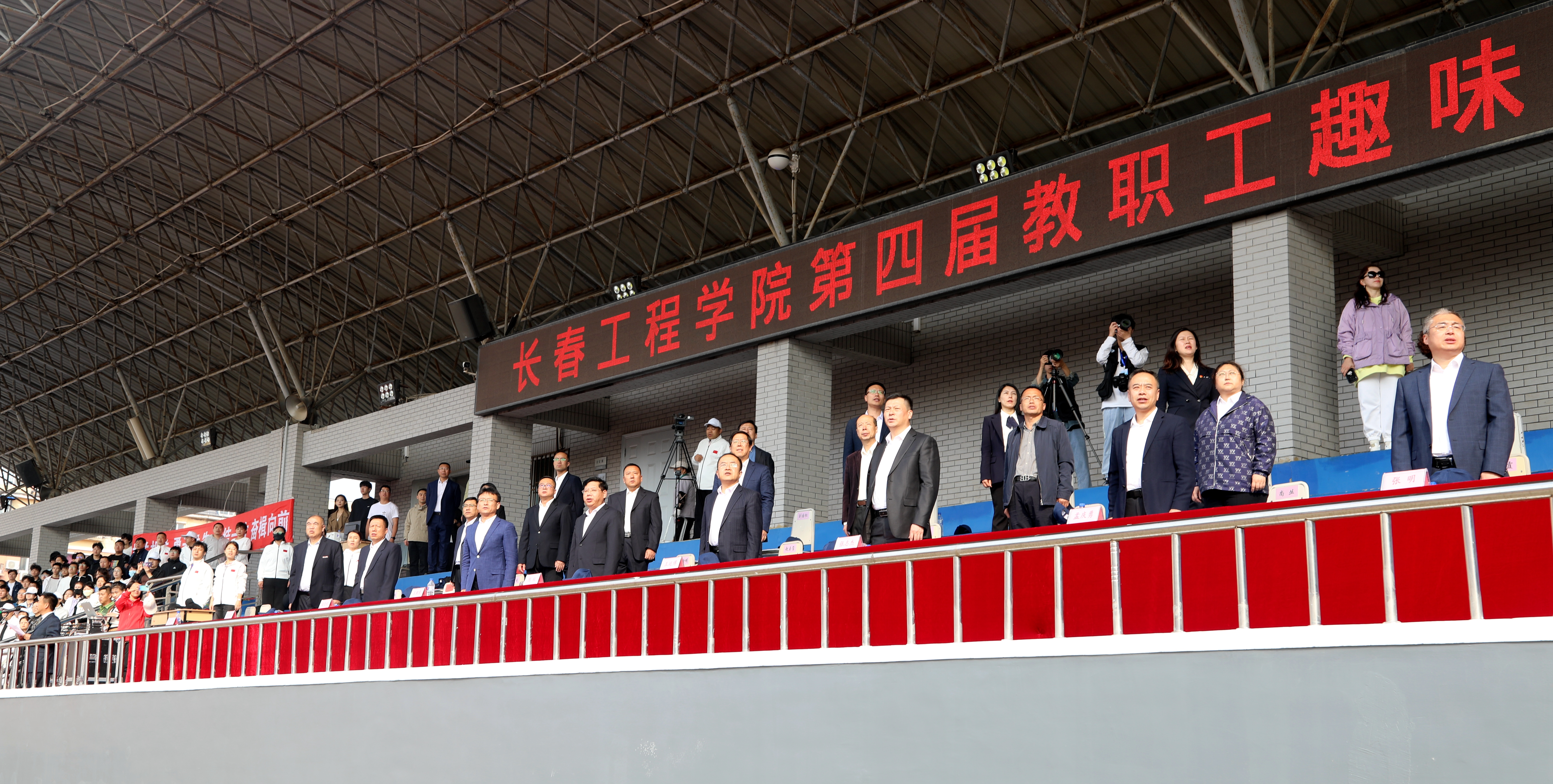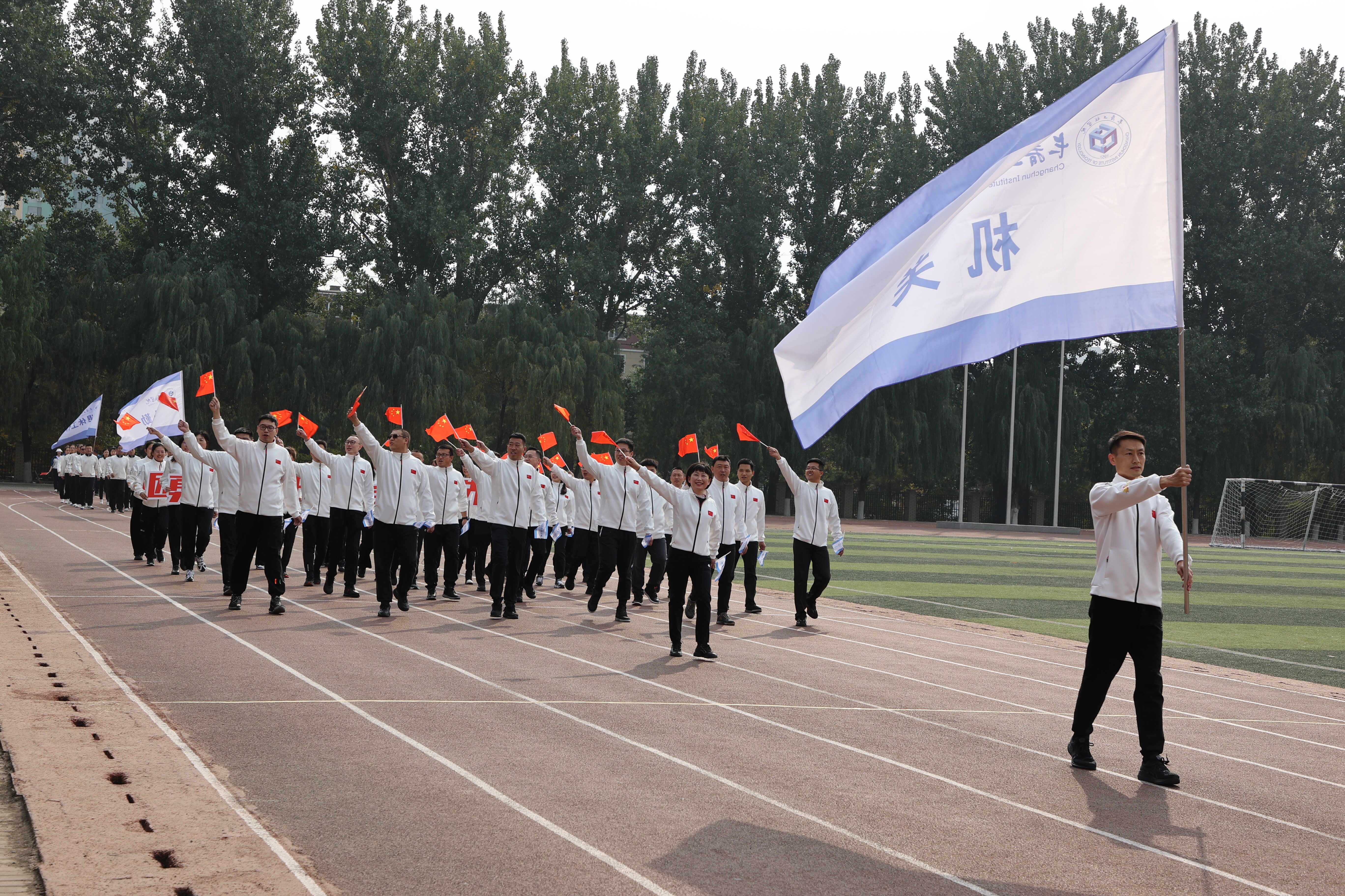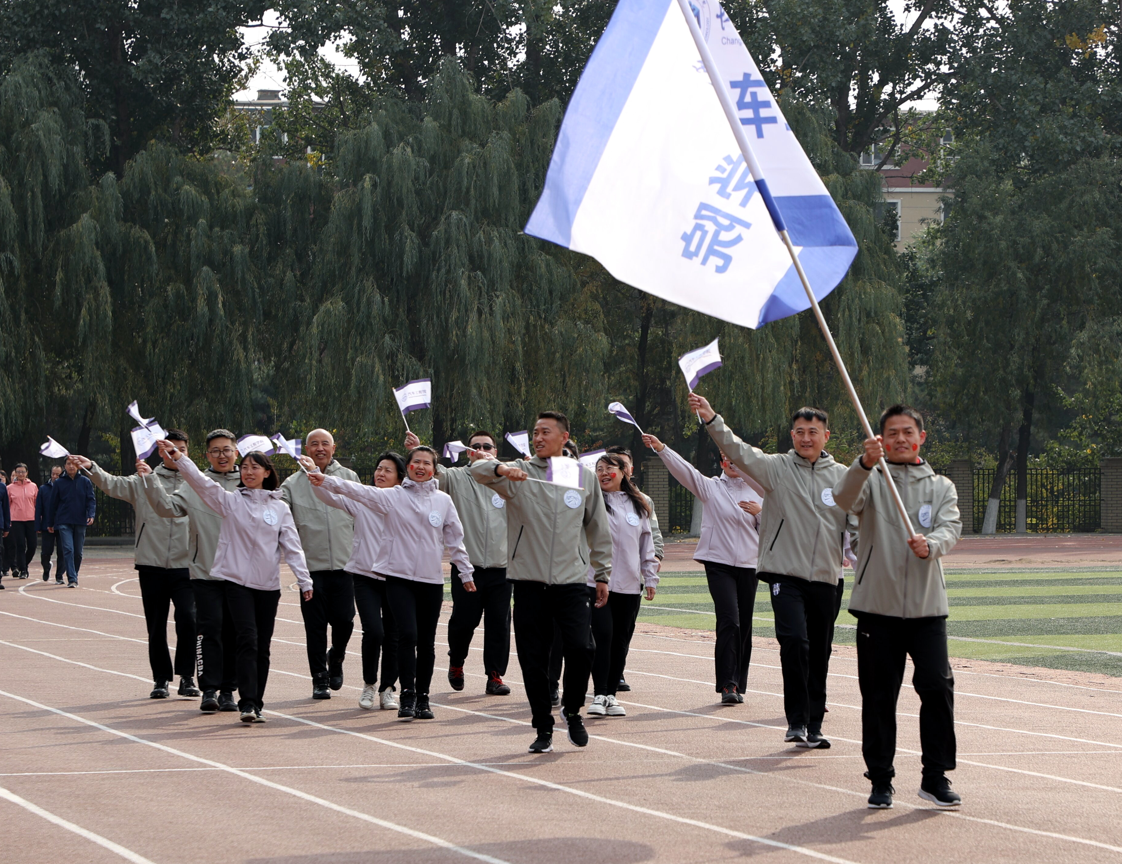 校长陈权宣布长春工程学院第四届教职工趣味运动会开幕。运动场上鼓声阵阵,队旗挥舞。
