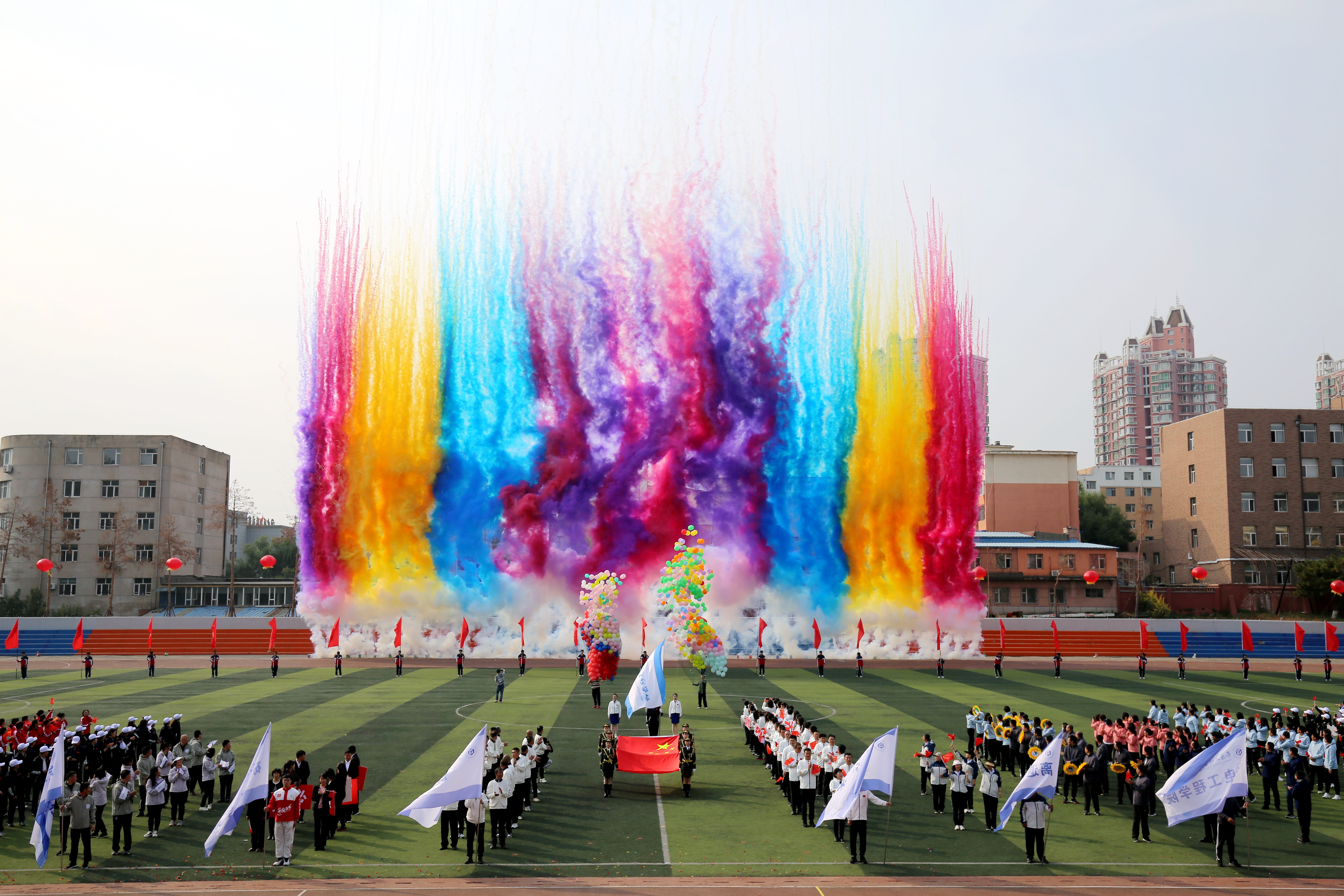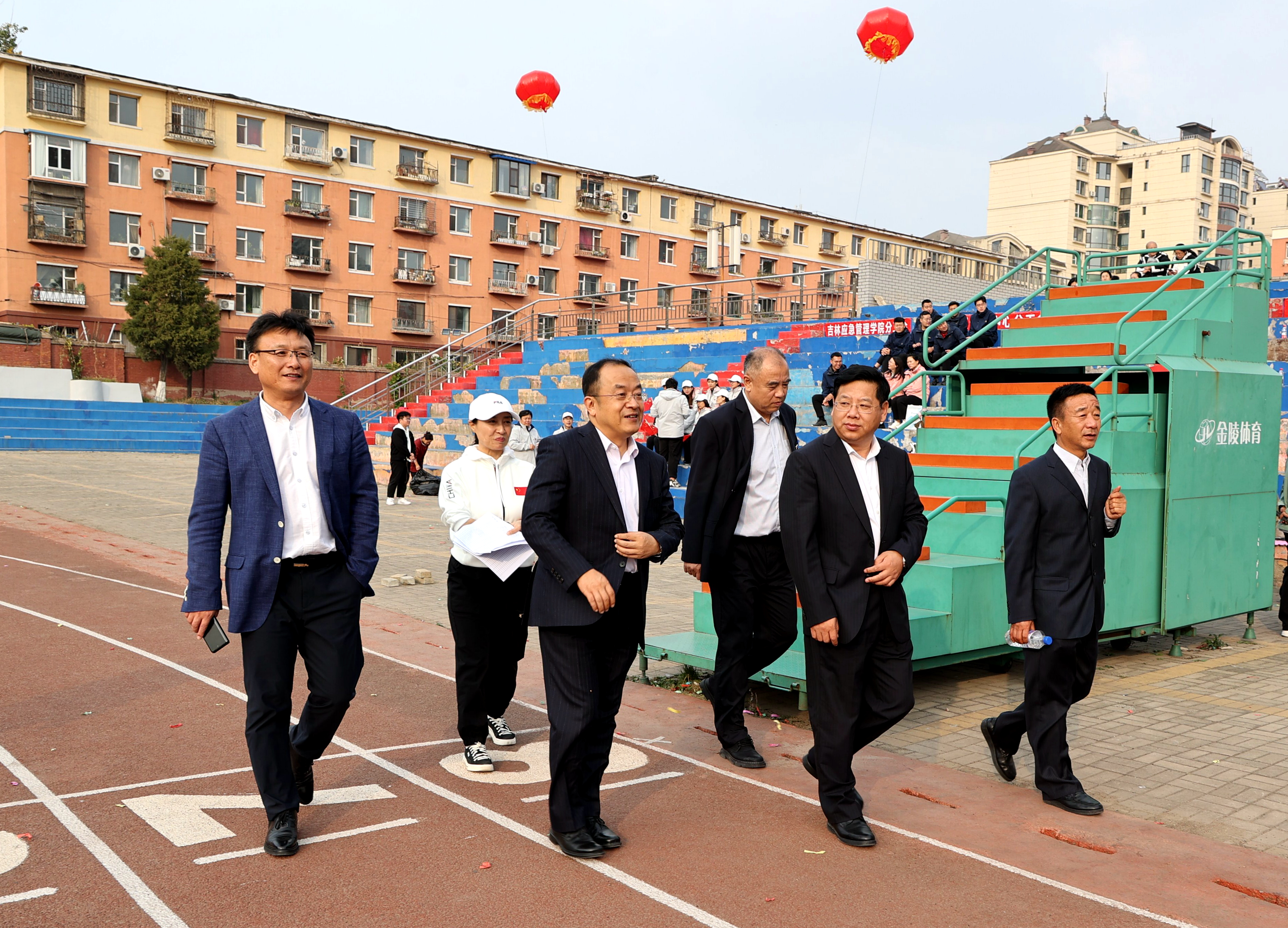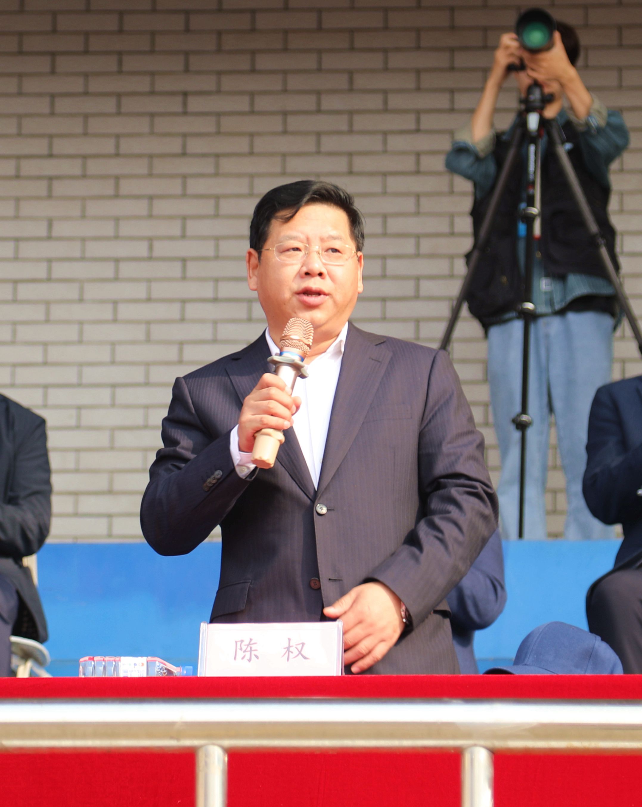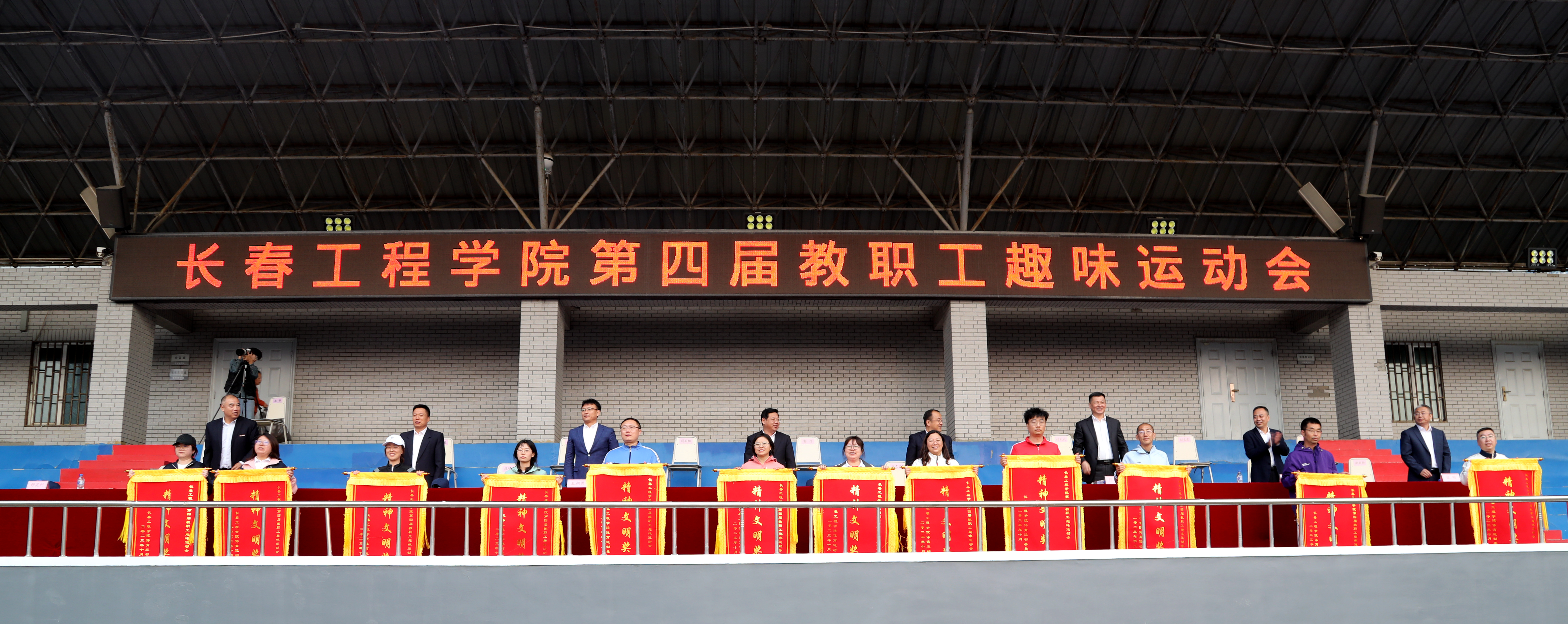 校长陈权宣布长春工程学院第四届教职工趣味运动会开幕。运动场上鼓声阵阵,队旗挥舞。