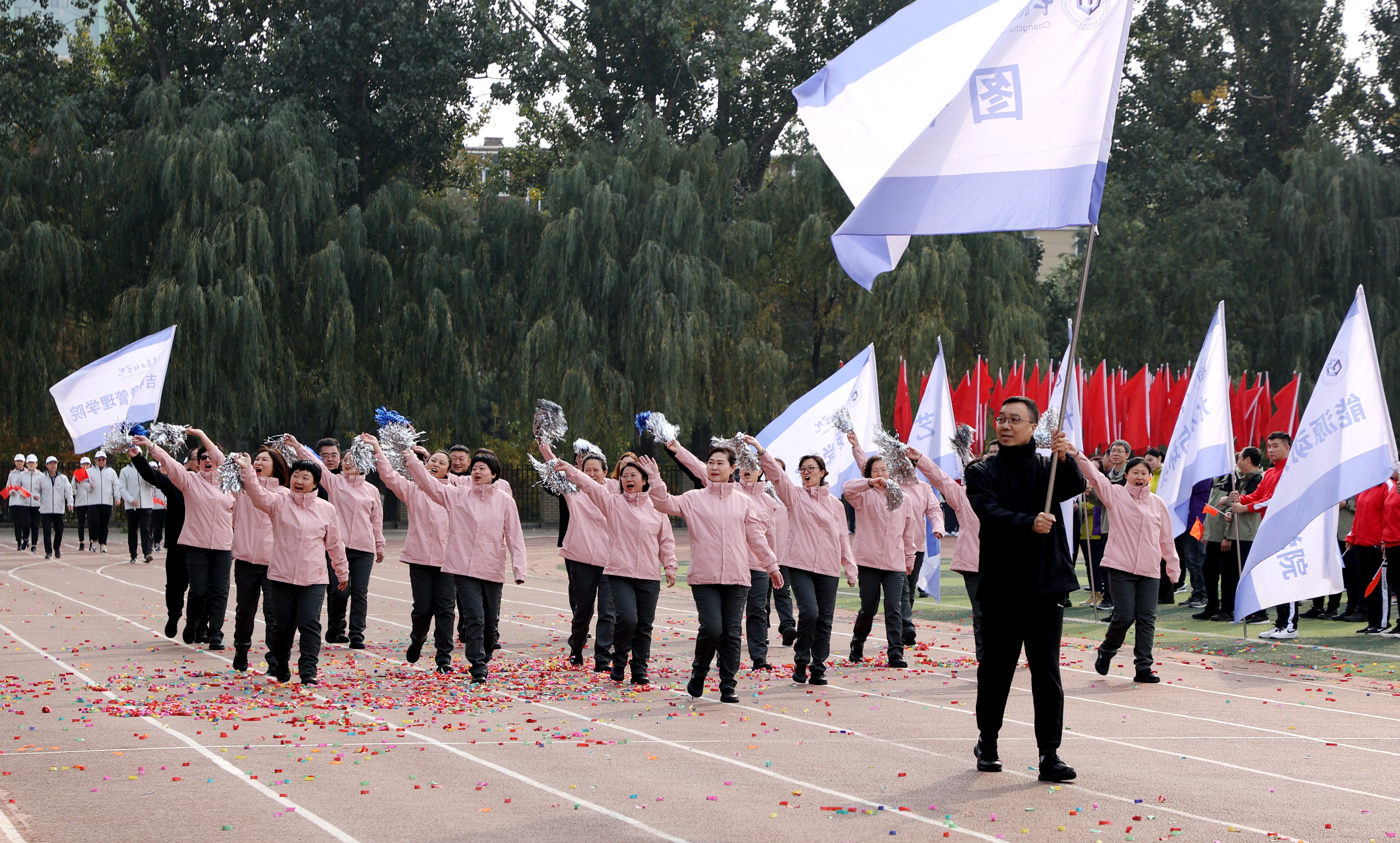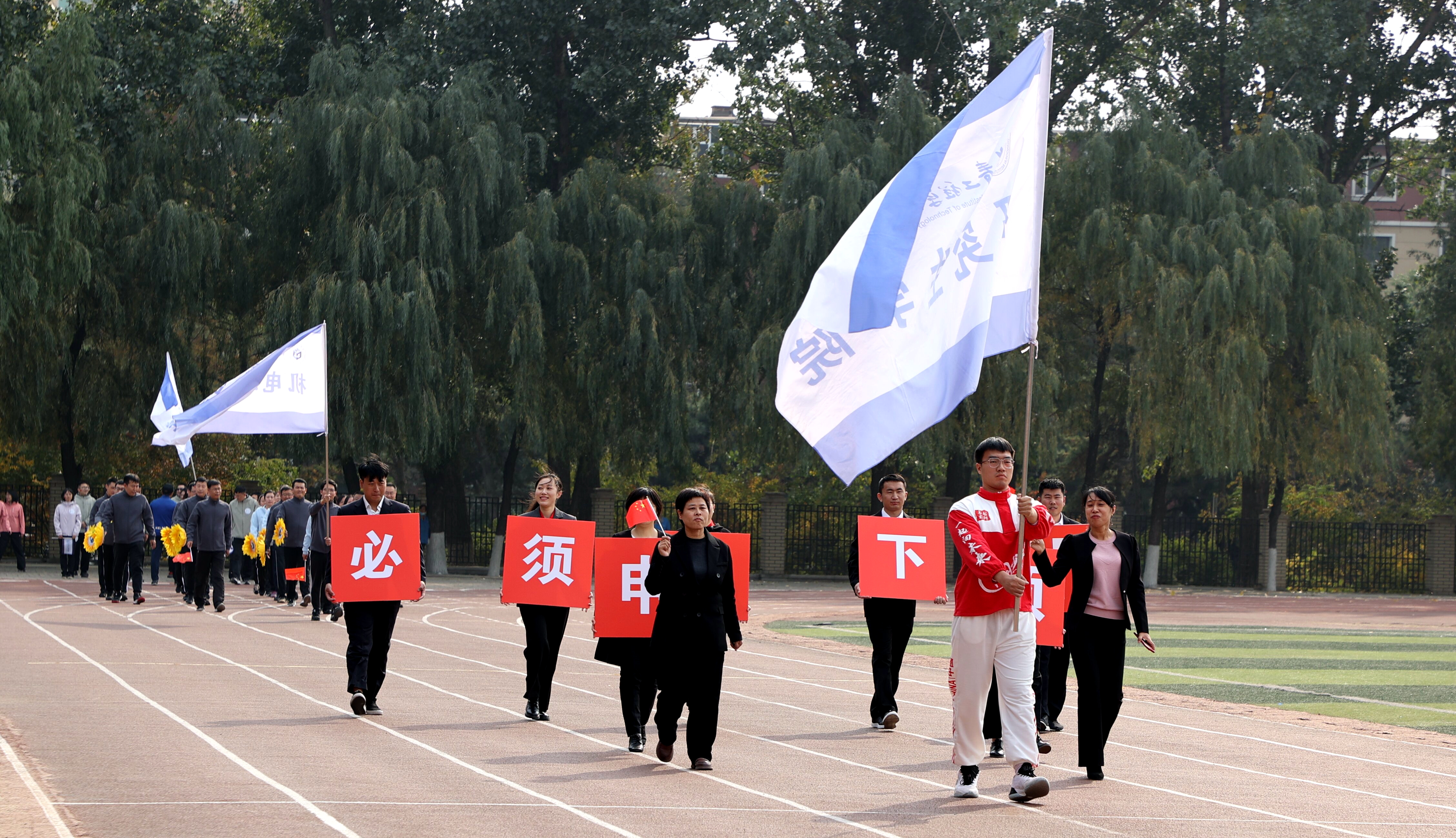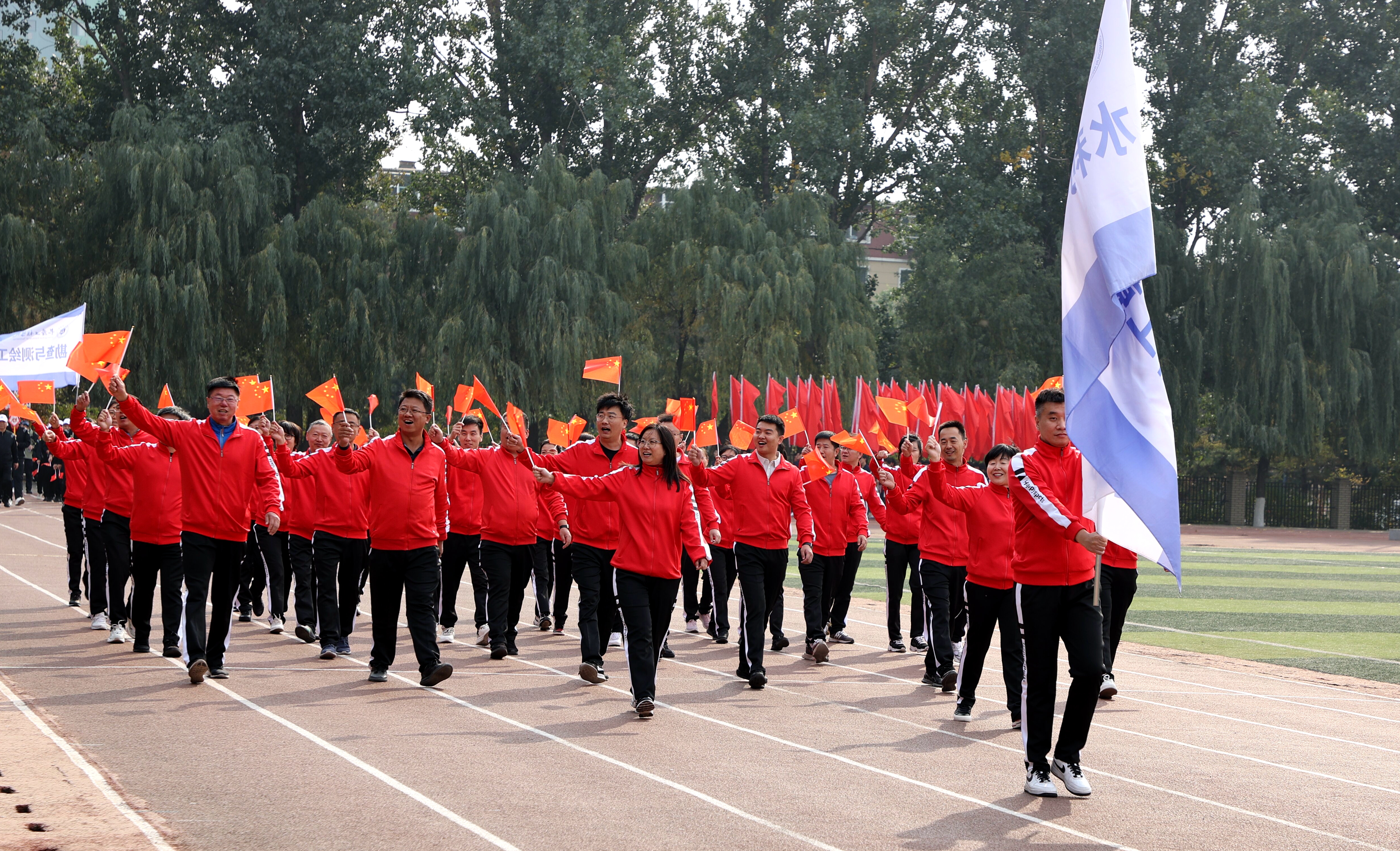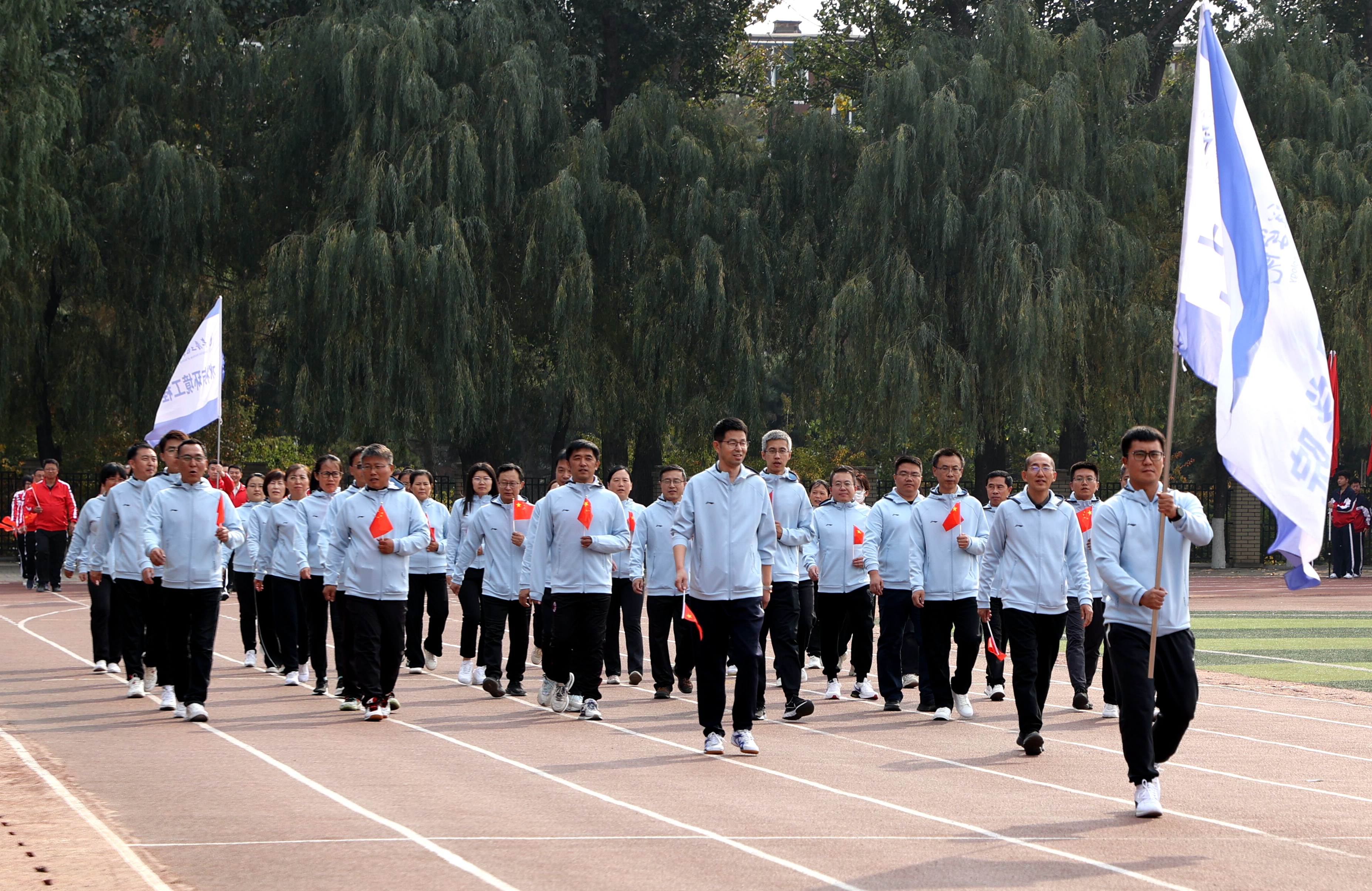伴随着运动员进行曲,25个分工会代表队迈着有力的步伐、喊着嘹亮的口号,依次走过主席台接受检阅,充分展示出我校教职员工明德致远、笃行务实、脚踏实地、锐意进取的精神追求。