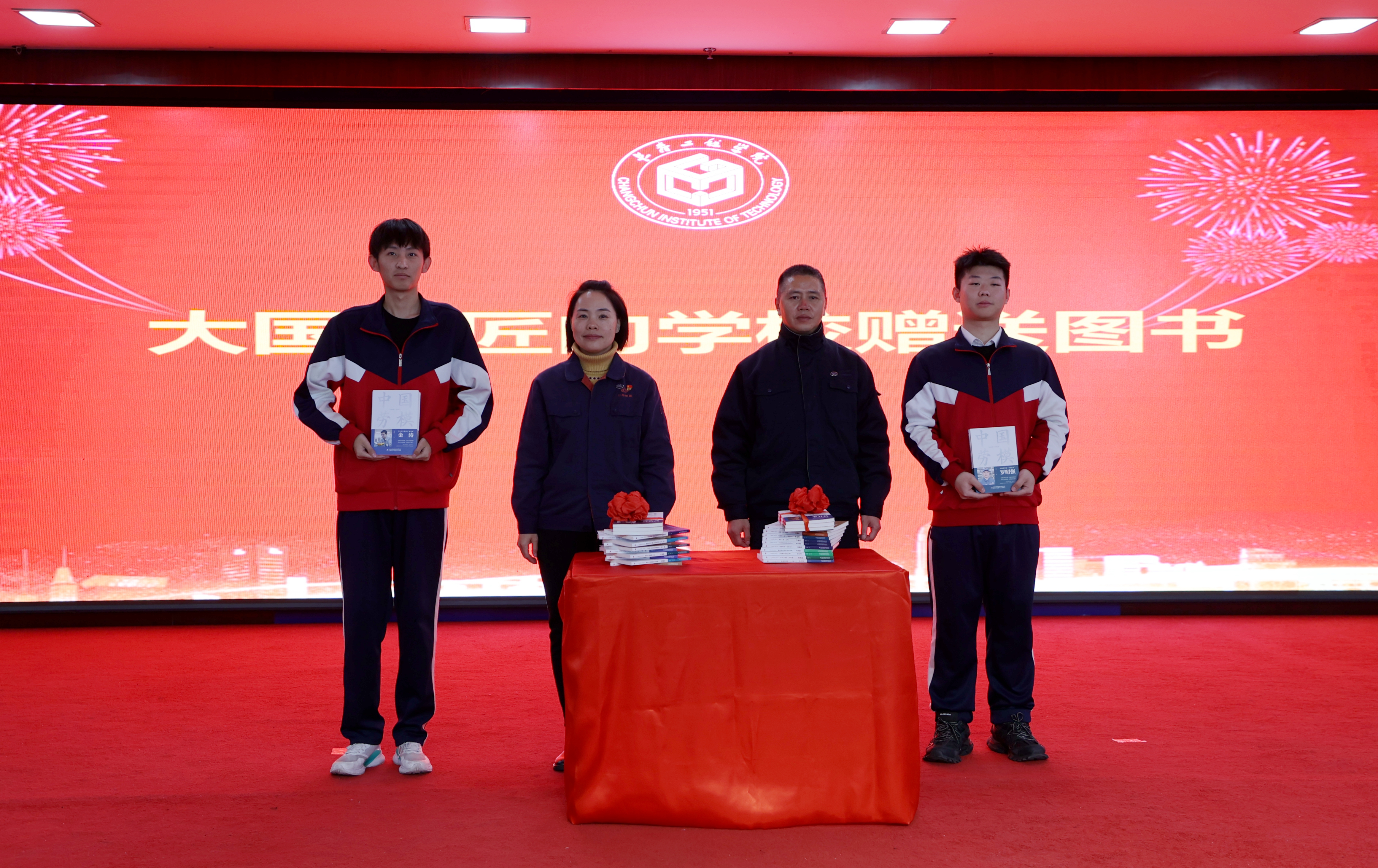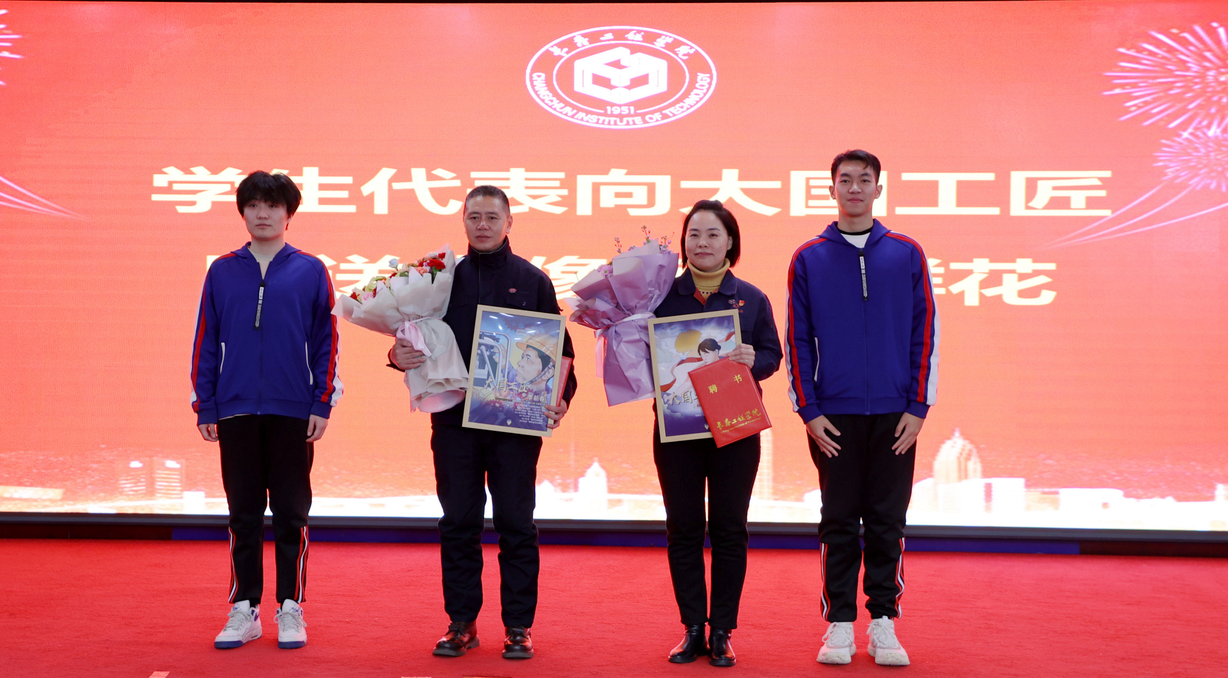 杨芳老师和李新春老师向同学们赠送图书,鼓励他们勤于创造,勇于奋斗。学生代表为两位大国工匠敬献肖像画和鲜花。