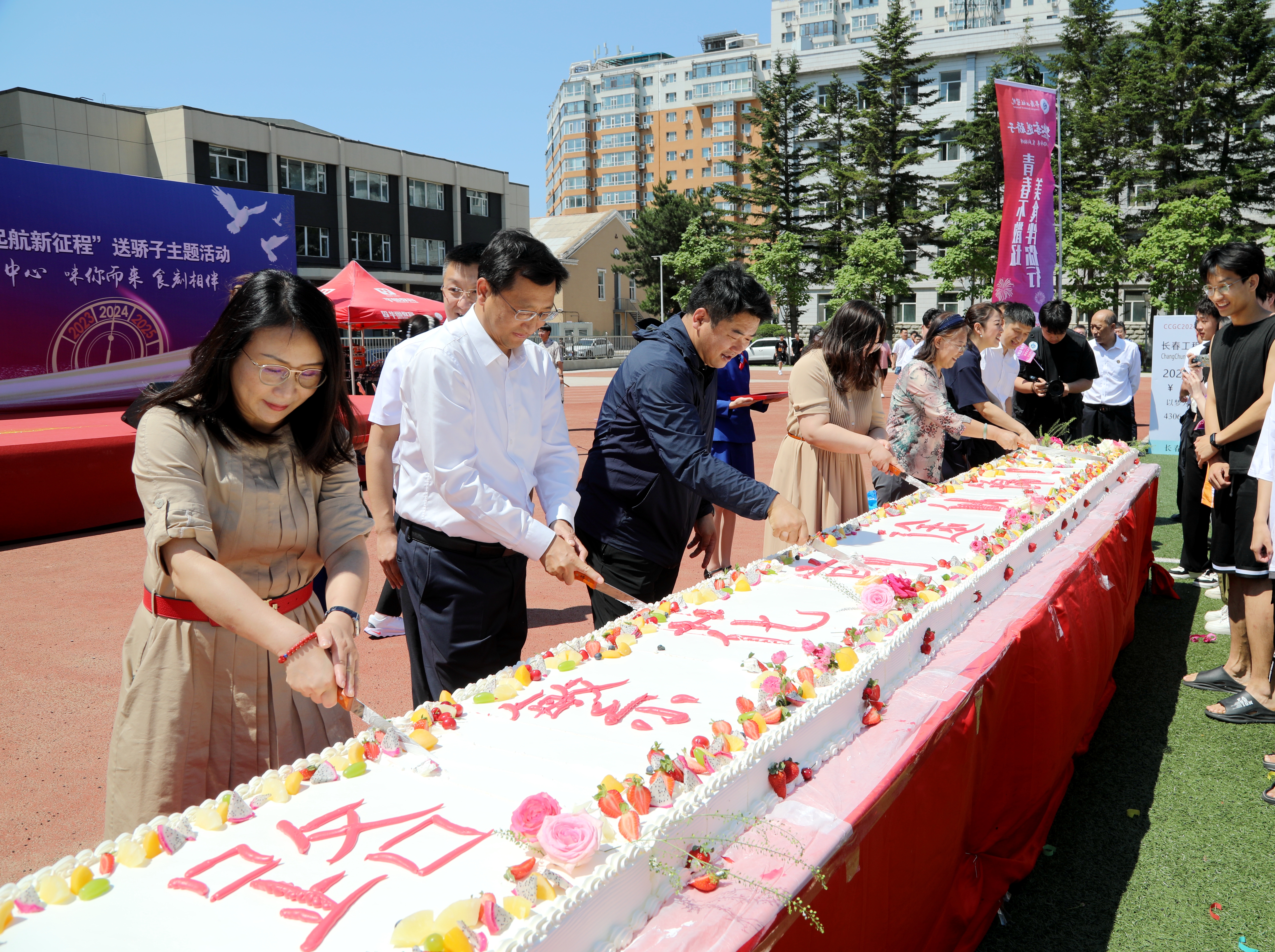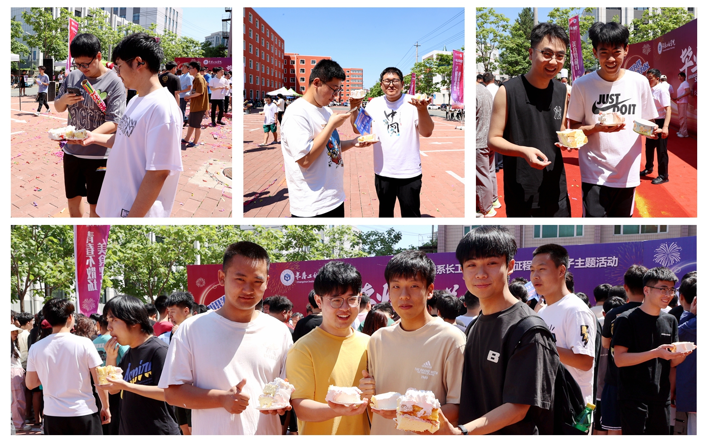 现场举行了洒金仪式,学校领导、各学院领导洒下金箔覆上条幅,“祝骄子一路繁花 前途似锦!”的温馨祝福也在阳光下熠熠生辉。饮食服务中心为毕业生们特别定制了长达10米的蛋糕,学校领导、各学院领导亲自为同学们切分了蛋糕,希望大家在今后的人生旅程里步步“糕”。