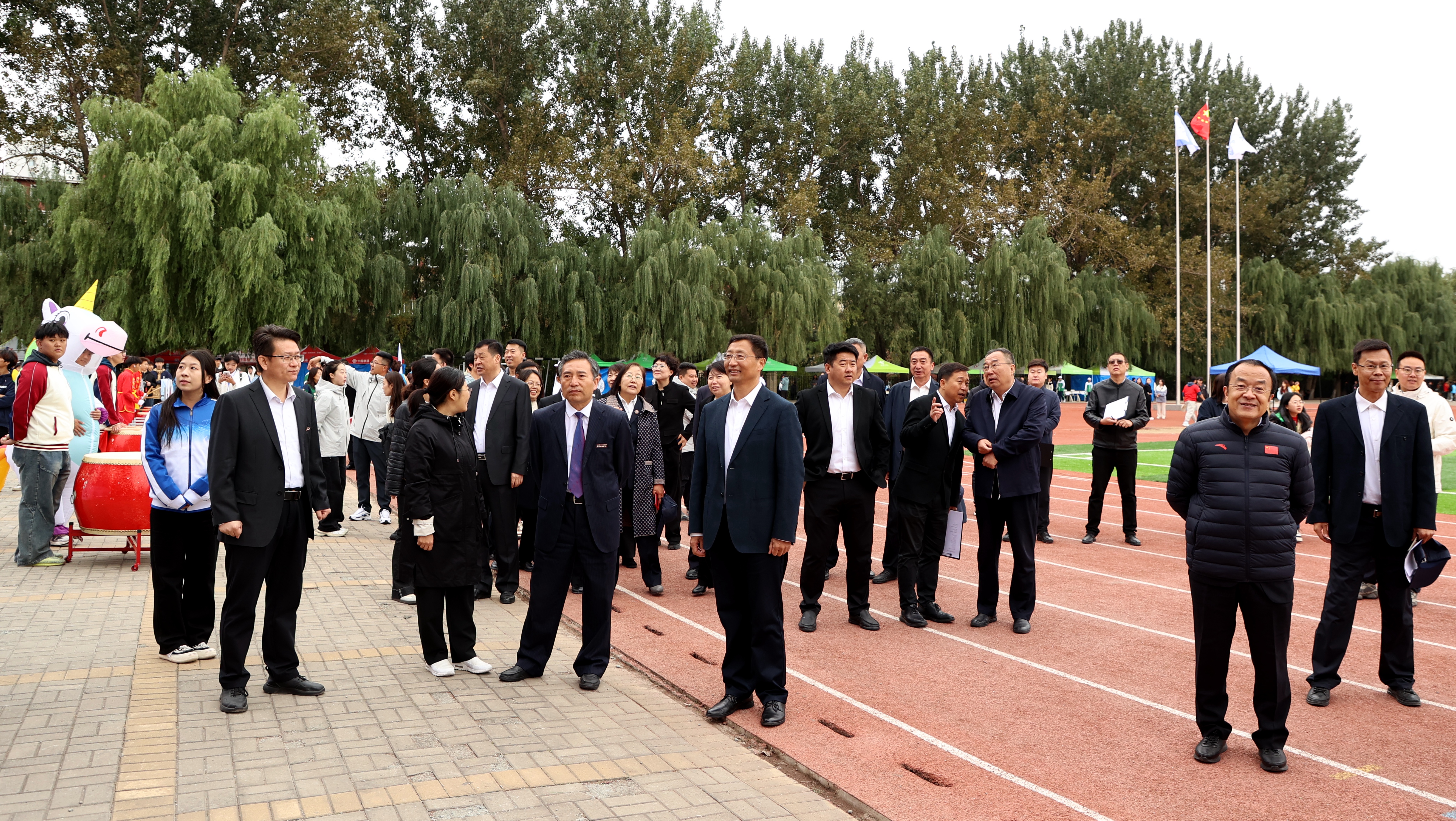 比赛中,学校领导来到赛场上与运动员和观众亲切交流。