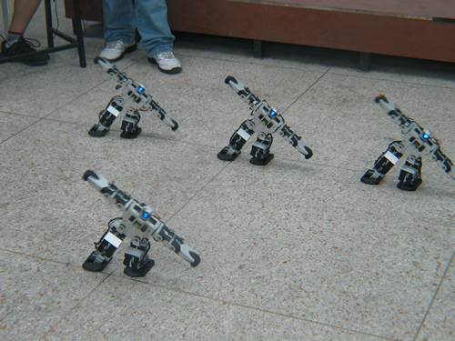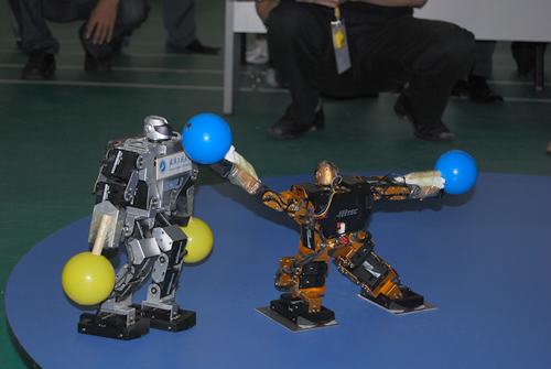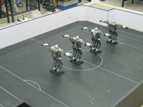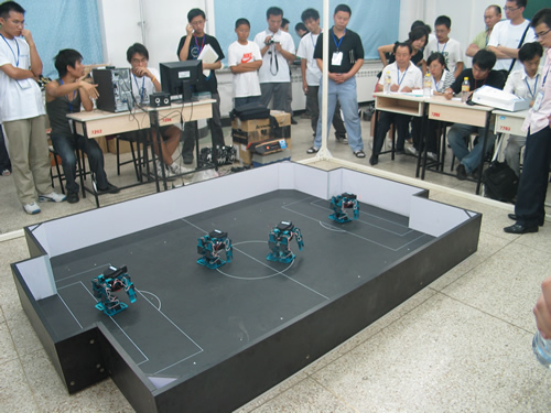 截止到17:30时,共进行了机器人拳击比赛、类人全自动机器人点球比赛 、4人组舞蹈比赛、8人组舞蹈比赛、类人半自动机器人3vs3足球(Semi-AndroSot)、半自主机器人5vs5足球(MiroSot)、三人队形比赛(Formation)与4vs1追捕目标比赛(Pursuit)、中小学生机器人灭火比赛、仿真机器人5vs5足球(SimuroSot)和小学生机器人足球比赛。各项比赛在裁判、领队、队员和志愿者的共同努力下紧张有序的进行。