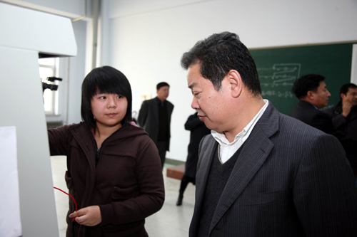 在党委书记李春生、院长韩立强等学校领导的陪同下,卢厅长一行先后到工程训练中心、水利馆、综合实验楼和土木工程实践基地视察。在工程训练中心,卢厅长一行实地考察了电力系统仿真中心、电工实验室、电子实验室、机械FMS实验室、机械类学生创新活动室和金工实训车间。他边走边看,向有关领导询问实验设备在人才培养、科学研究中的利用情况,向在实验室做实验的学生了解学习、生活情况。在电力系统仿真中心,卢厅长详细询问了系统运行过程和作用。他说,这样好的设备要在教学和科研的同时,为企业培训人才。在机械类学生创新活动室,当他看到我校学生参加吉林省大学生机械创新大赛、全国第三届大学生机械创新大赛的获奖产品——“有机肥生产系统”、“自动垃圾分拣器”时,卢厅长饶有兴趣地询问师生们产品研制情况和应用前景,亲切地问参加研制的学生“大几啦?”“研制产品用了多长时间?”“攻关阶段遇到难题如何解决的?”“收获怎么样?”“对学业的促进大吗”等等,当听到学生从大二、大三就开始利用业余时间参加老师的科研工作,不仅丰富了专业知识,而且拓宽了知识视野,对学业促进非常大的回答时,卢厅长会心地笑了,连声说:“好!好!”。在一楼大学生金工实训车间,卢厅长详细了解了传统工艺实习和现代制造技术实习的各个环节。在数控铣床前,卢厅长与两名同学攀谈起来,卢厅长亲切地问:“你们是哪个专业的?”同学答:“我们是电气工程自动化专业的。”卢厅长略带惊讶地问:“电气工程自动化专业的学生也参加金工实训吗?”同学答:“我校是培养应用型人才的,所有专业的学生都参加金工实训。”一旁的工程训练中心主任刘玉忠补充到:“学生参加金工实训主要是为了培养学生的工程素质。”卢厅长在观看了学生的实际操作后说:“很好!”在水利馆,卢厅长仔细询问了建设情况,叮嘱专业负责人要使水利馆在教学和科研中发挥更大作用。在水工仿真模拟实验室,卢厅长一行从不同角度参观了水工仿真模型,对模型的作用、功能进行了全面了解。卢厅长一行在土木工程结构实验室考察时,他在千吨压力机前驻足,听取专业负责人的介绍,观看了学生的实际操作。最后,他们来到了土木工程实践基地,参观了施工现场,卢厅长对在真实的环境中进行人才培养的做法给予了充分肯定。