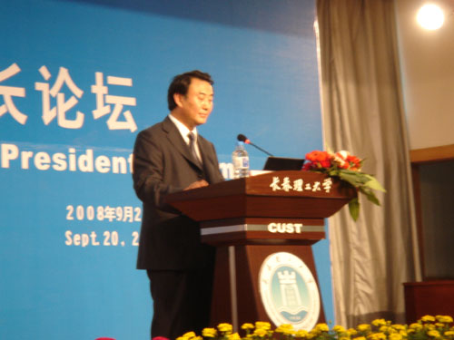 2008年9月20日,“中外大学校长论坛”在长春理工大学学术报告厅举行。我校校长韩立强教授接受论坛组委会的邀请,在会上做了题为“Views on Application-oriented Undergraduate Education”的主题发言。有18位来自国内外大学的校长参加了本次中外大学校长论坛。除我校之外,做主题发言的还有挪威布德大学校长帕克•佩德森、俄罗斯圣彼德堡国立信息技术大学尤里•卡列斯尼果夫、美国亚利桑那大学光学科学学院副院长卡尔•梅斯、俄罗斯布里亚特国立大学校长斯捷巴•卡尔梅果夫、燕山大学校长刘宏民和东道主长春理工大学副校长史国权。论坛以“21世纪大学的理念与发展战略”和“大学人才培养与科技创新”为主题,就共同关注的高等教育发展和大学建设问题进行了探讨,分享了各国高等教育发展和大学建设的丰硕成果及有益经验。