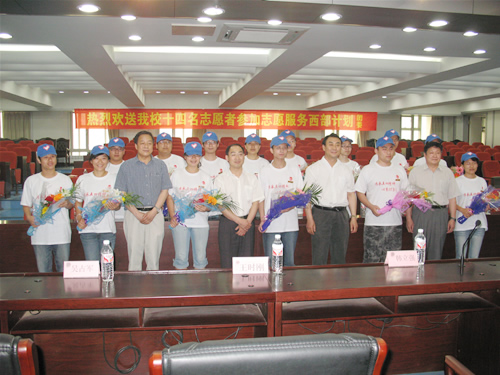 会后,学校领导与志愿者们一一握手并亲切交谈,鼓励志愿者努力工作,学校期待他们载誉归来,常回家看看;志愿者们一致表示:请母校放心,一定真诚服务西部,为学校争光。学校领导与志愿者合影留念。